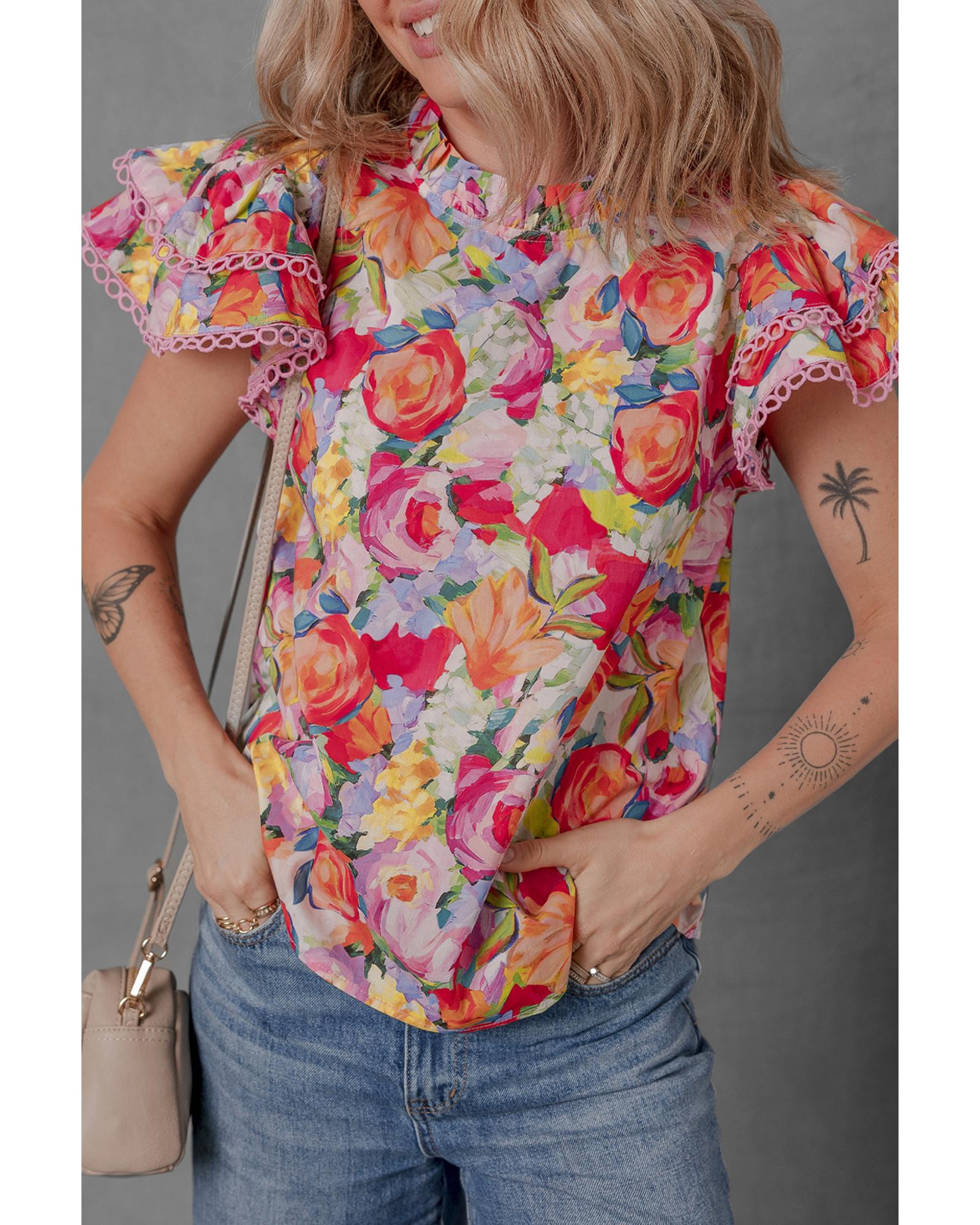 This floral blouse features a charming design with delicate lace trim and ruffled short sleeves, offering a stylish and feminine look suitable for various occasions. The intricate details and elegant accents make it a versatile addition to your wardrobe.