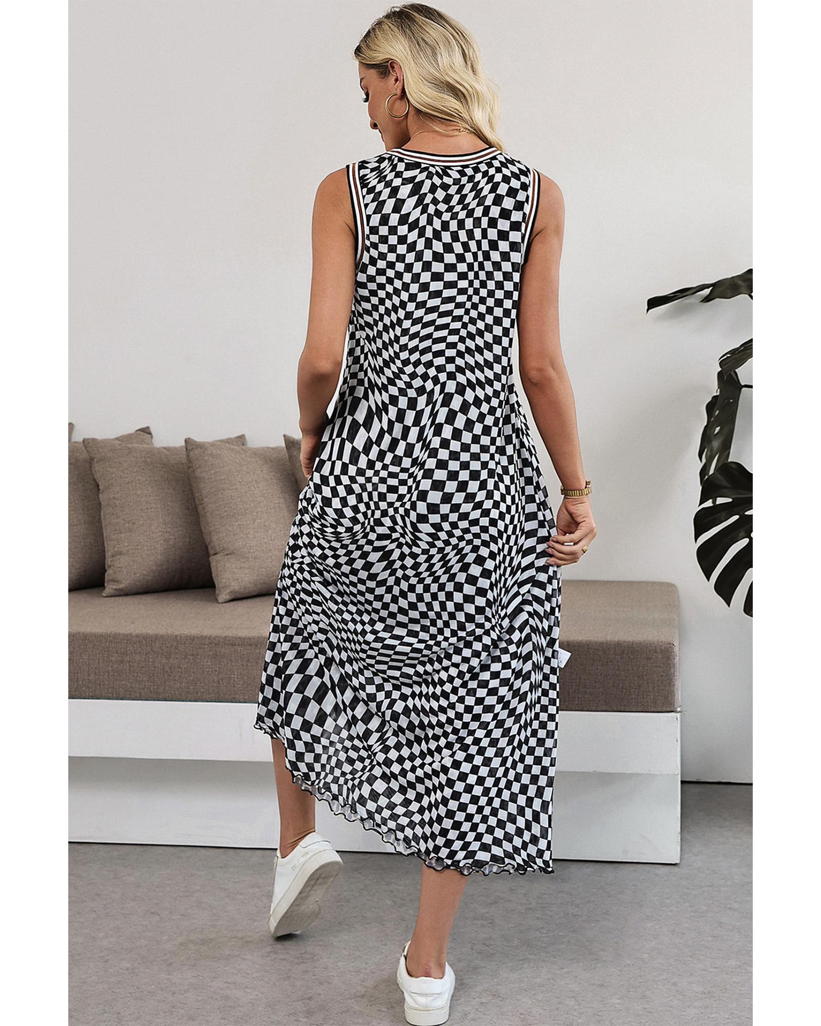 This sleeveless long dress features a vibrant multicolour leopard checkered pattern with a reversible design, offering two distinct styling options. Its ankle-length cut provides a flowing and elegant appearance, making it suitable for summer wear. The dress combines bold patterns with a comfortable fit, perfect for a ready-to-wear look.
