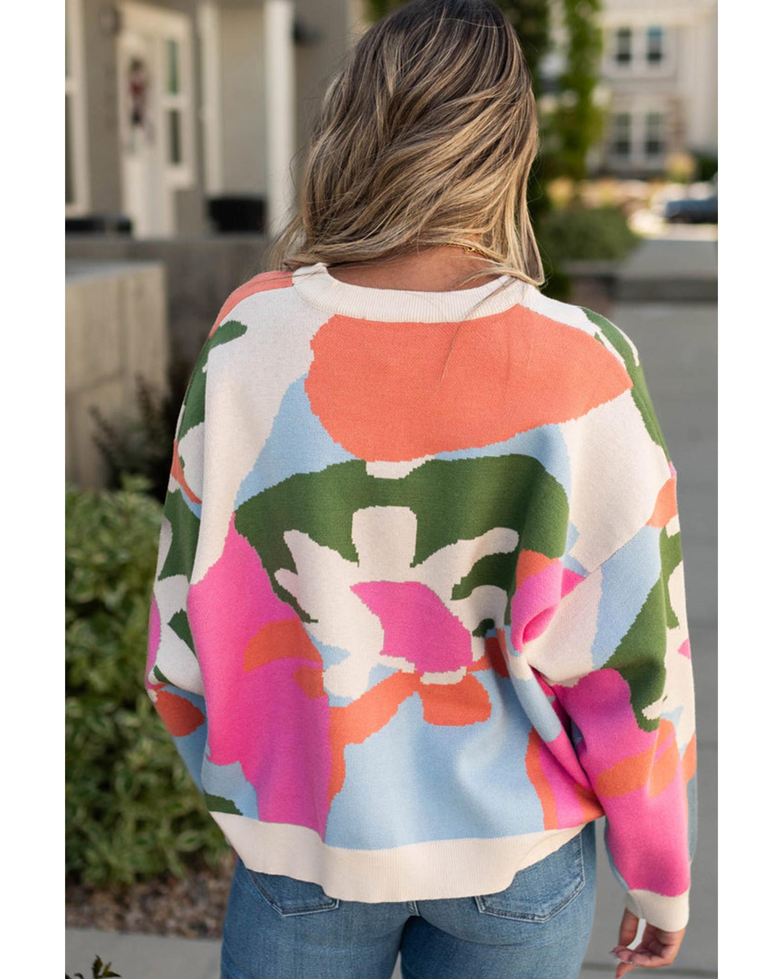 This multicolour plus size floral drop shoulder sweater offers a trendy and comfortable fit, designed to enhance your wardrobe with its stylish floral pattern and relaxed silhouette. Made from soft, high-quality materials, it provides both comfort and versatility for various outfits.