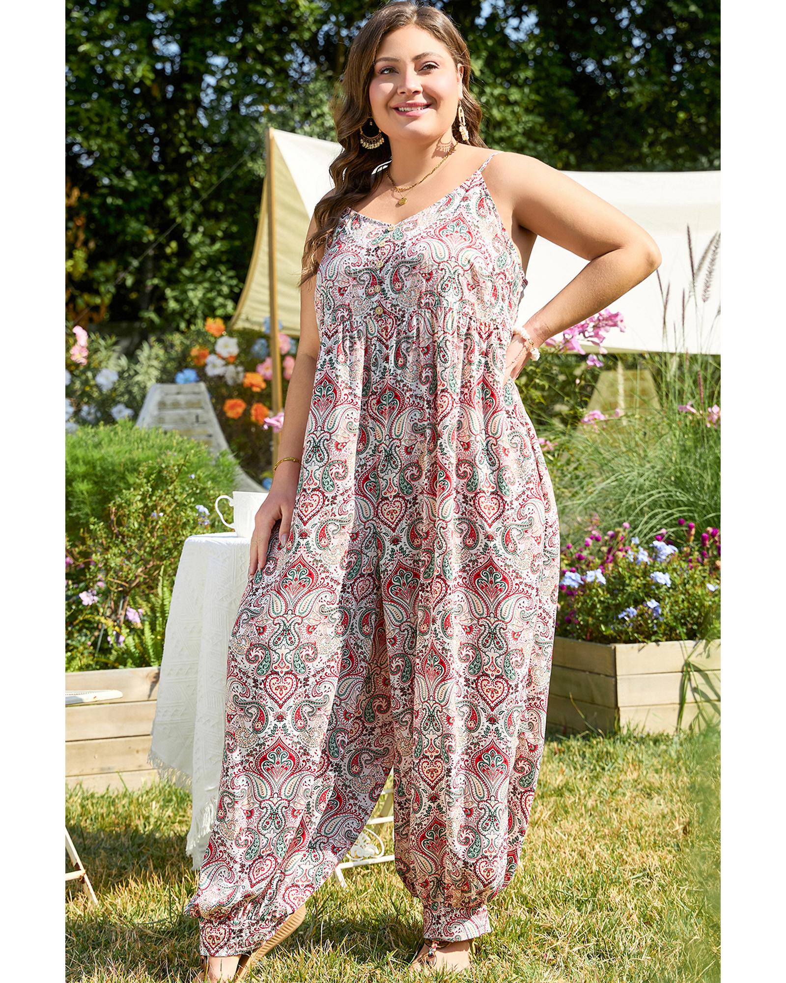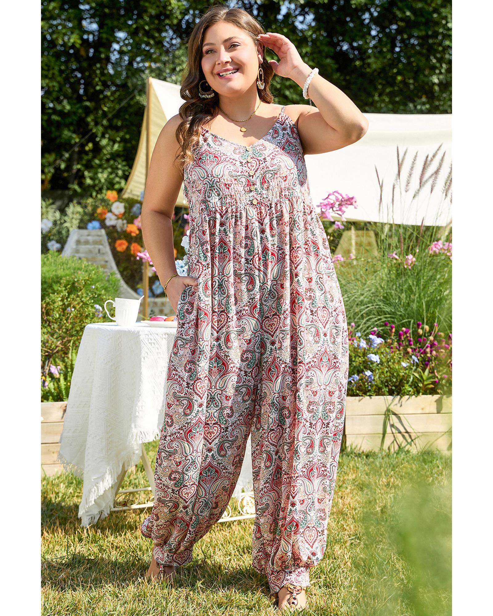 This multicolour plus size paisley print jumpsuit features a sleeveless design with a V neckline, offering a stylish and comfortable look. The high-waisted jogger style provides a flattering fit suitable for various body shapes, making it a versatile addition to your wardrobe.