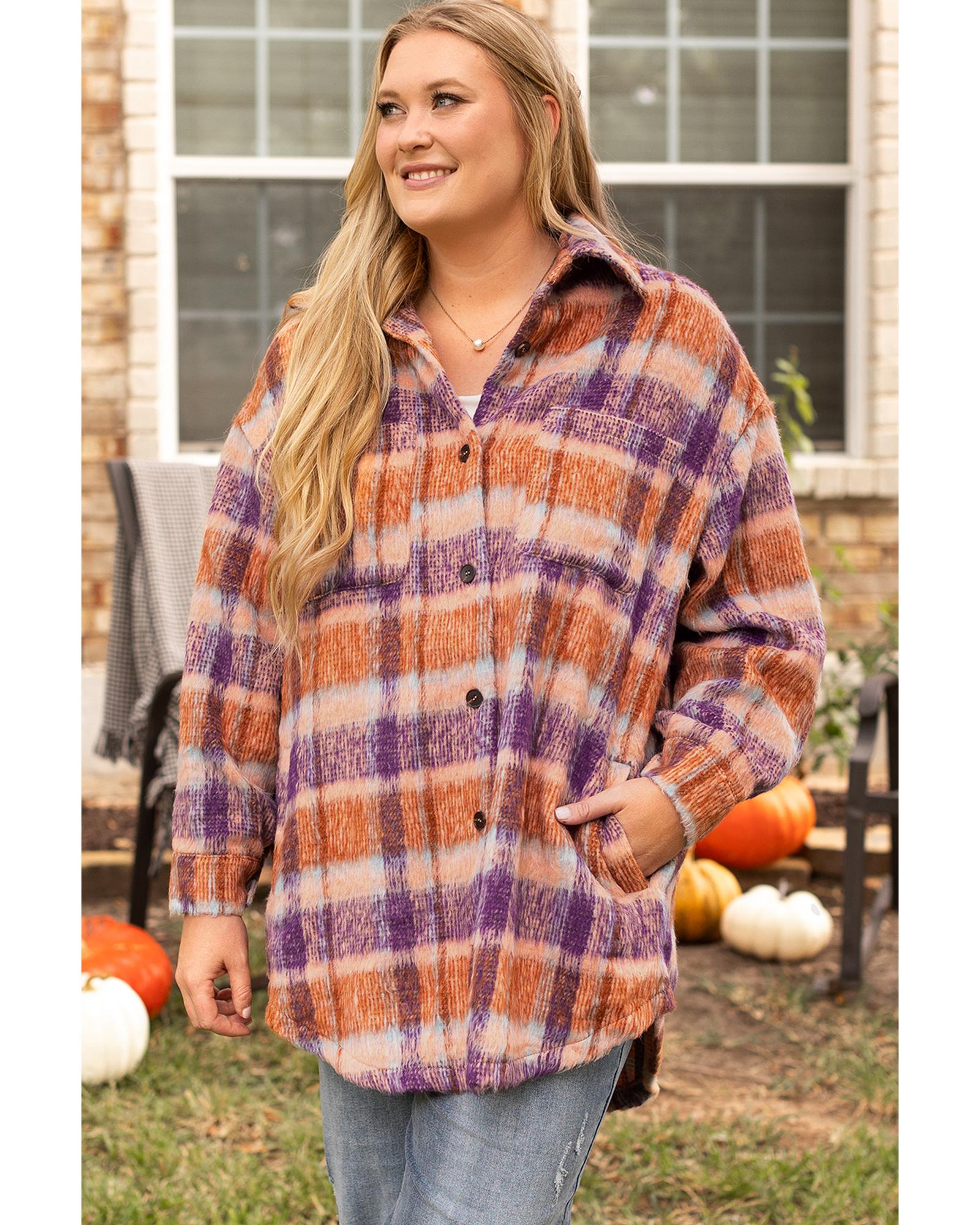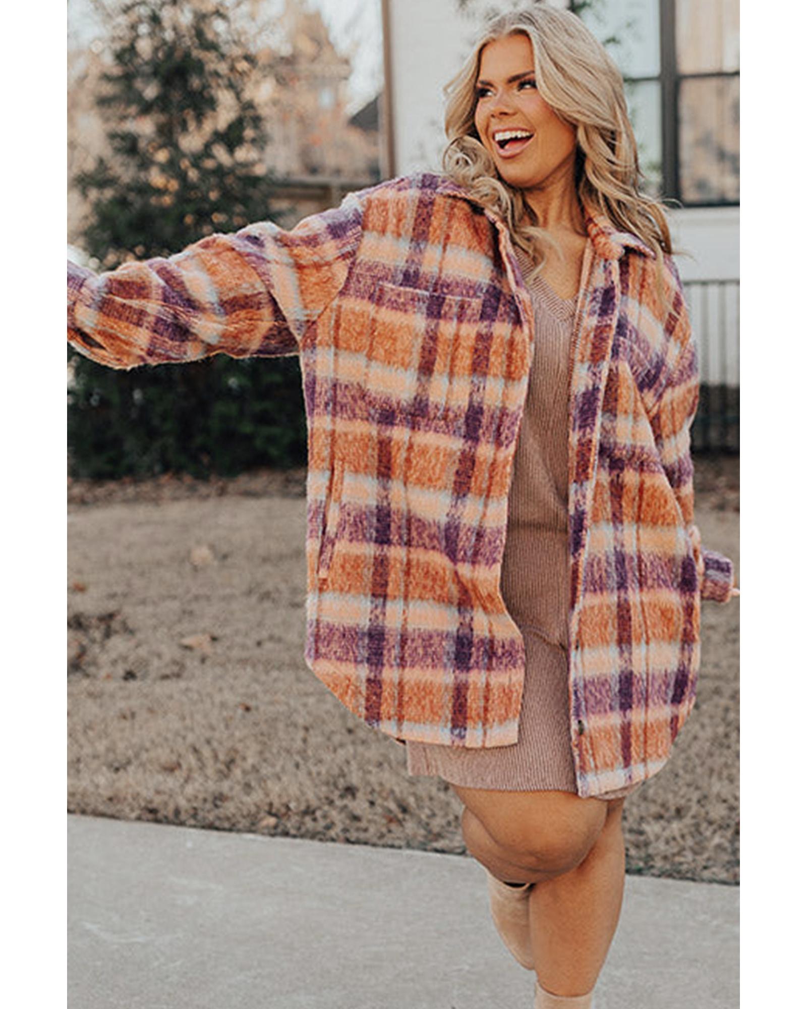 Multicolour Plus Size Plaid Print Collared Button up Jacket – 1X