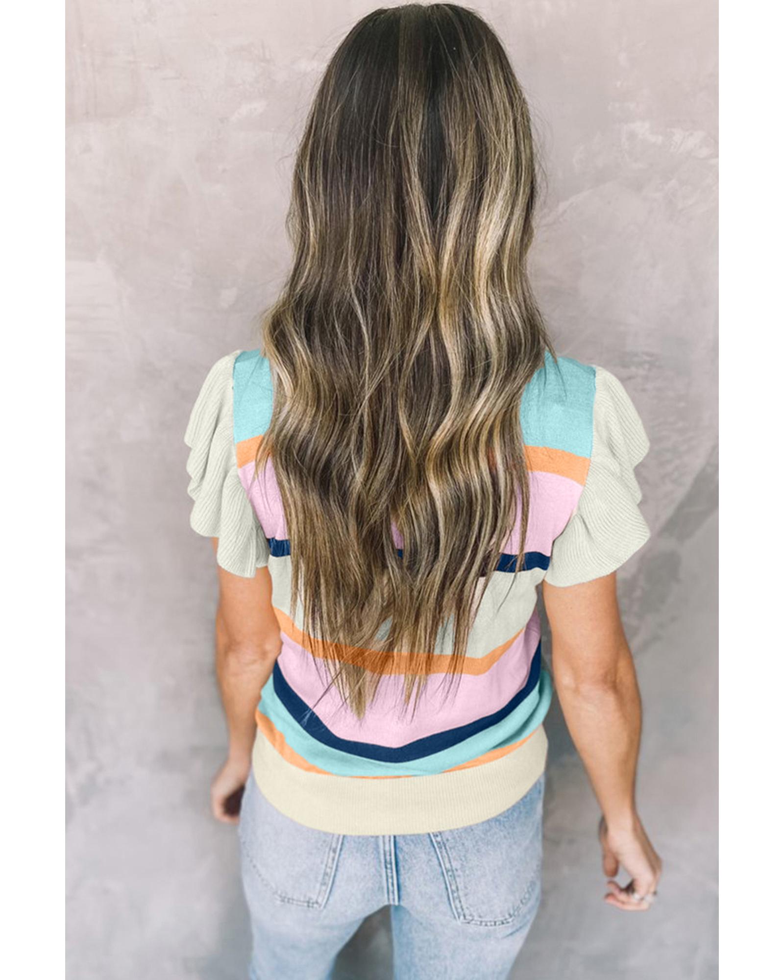 This multicolour striped color block sweater top features a stylish flutter sleeve design, making it a versatile addition to your wardrobe. Crafted from soft, breathable knitted fabric, it offers comfort and ease of movement. The vibrant stripes and colorblock pattern add a lively touch to your outfit, suitable for pairing with jeans or skirts for various occasions.