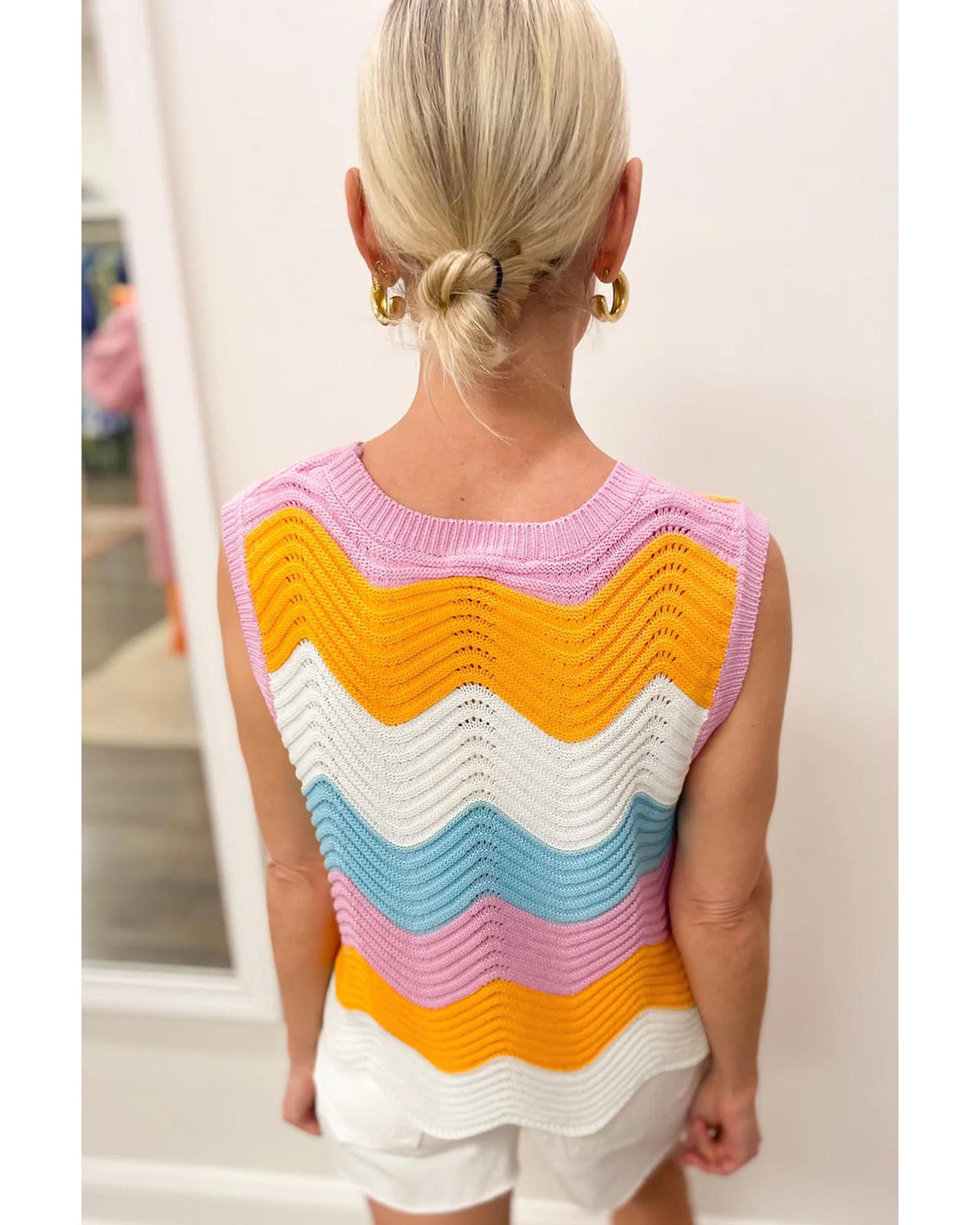 This multicolour striped colorblock knitted vest features a stylish scalloped hem and a cheerful multicolor palette. Designed with a trendy fitted look, it offers a perfect blend of comfort and style, making it suitable for pairing with any casual bottom. Available in various sizes, it is crafted from a comfortable blend of acrylic and cotton.