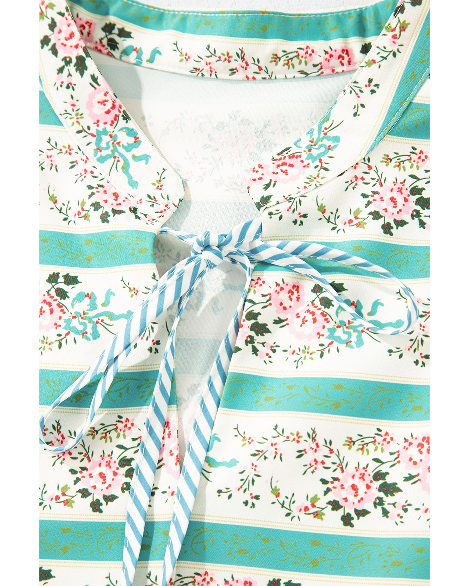 This midi dress features a vibrant multicolour striped floral print, combining stylish design with comfort. It is designed with a tie split neckline and ruffled detailing, complemented by puff sleeves for a fashionable look. The dress offers a chic and versatile option suitable for various occasions.
