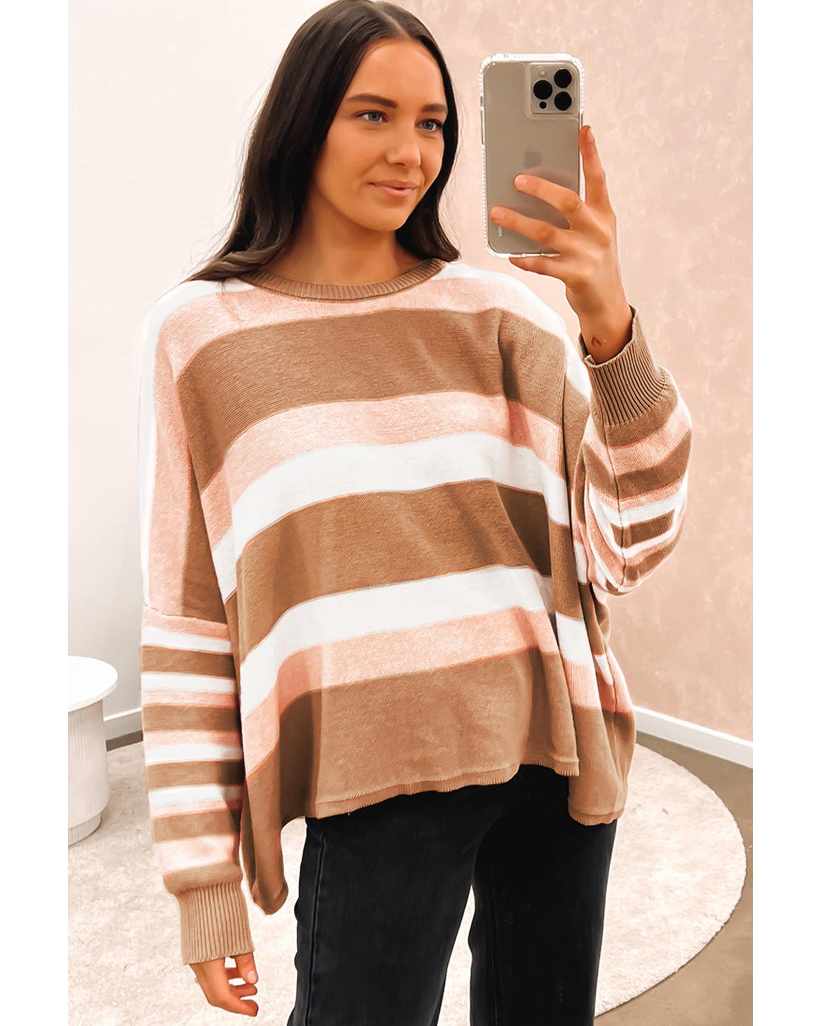 This multicolour striped knit sweater features a loose fit and drop shoulder design, offering a trendy and comfortable style suitable for any gender. The vibrant stripes add a lively touch to your wardrobe, making it a versatile choice for various casual occasions.