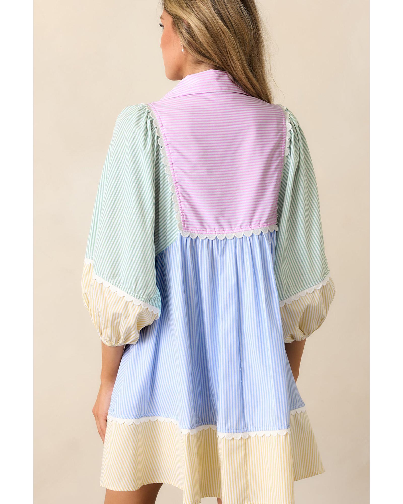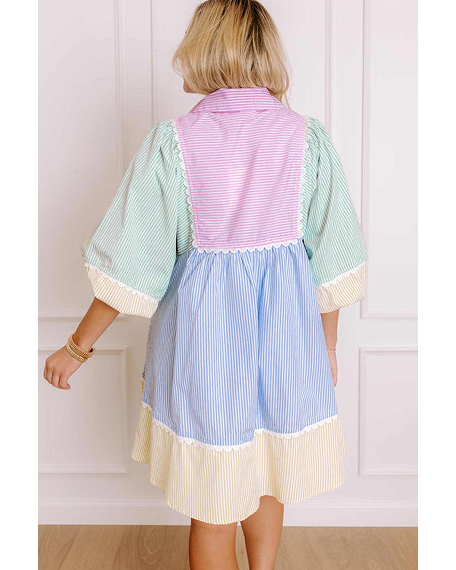 Multicolour Striped Patchwork Ric Rac Puff Sleeve Collared Mini Dress – L