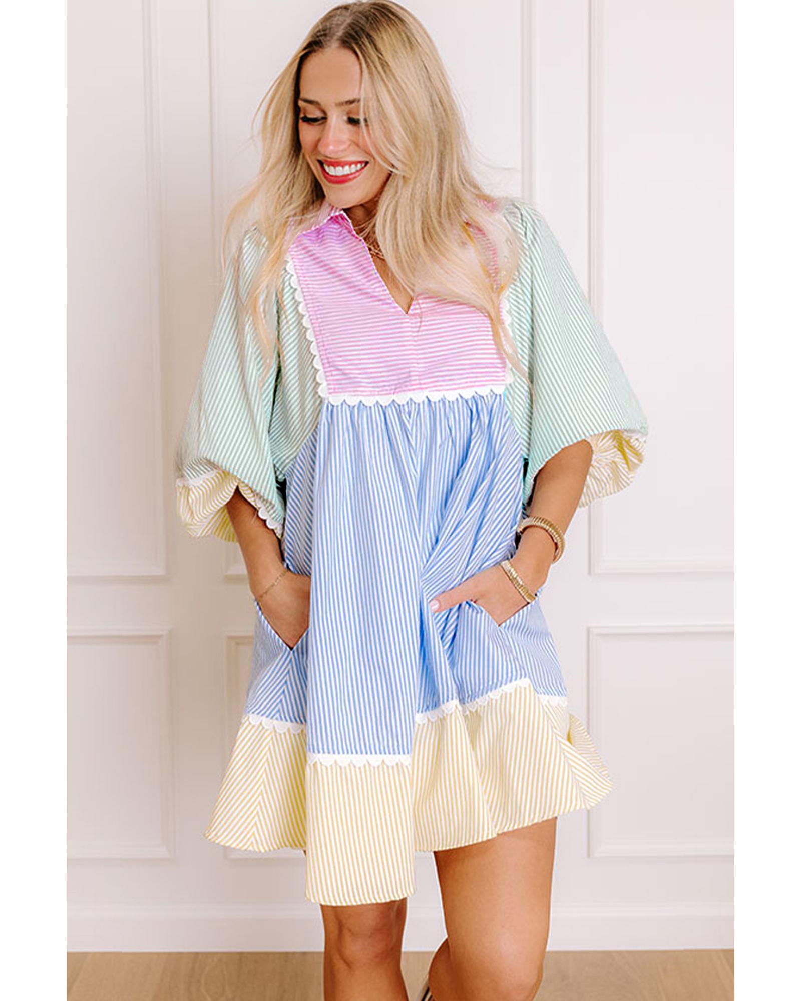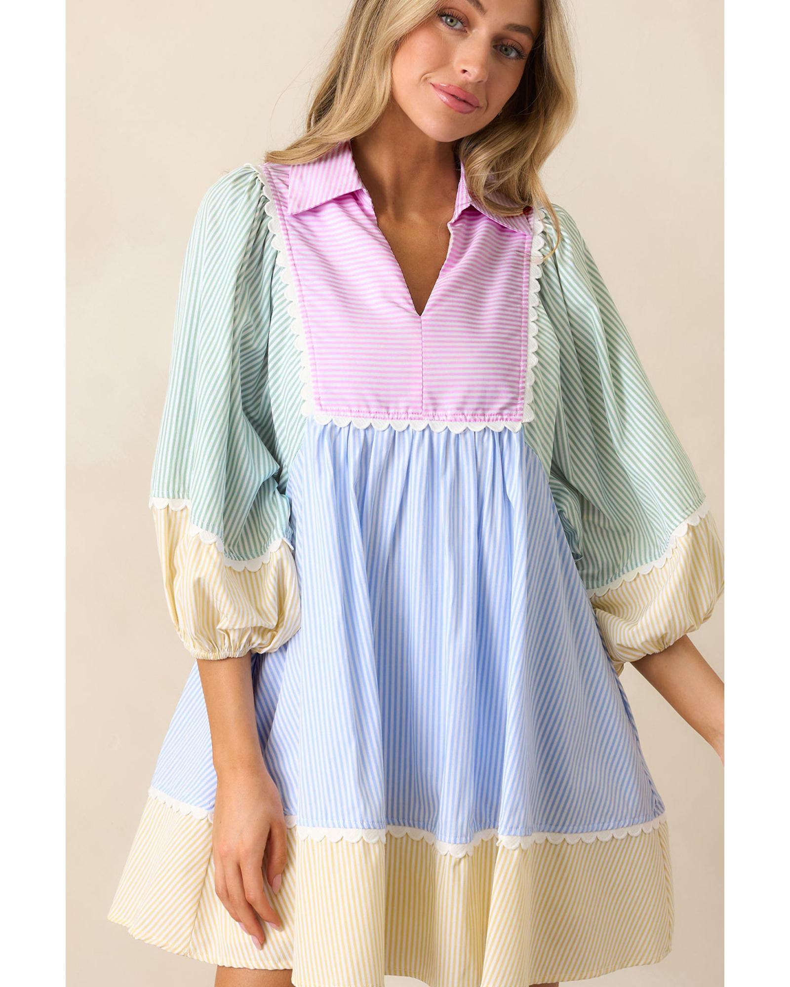 This mini dress features a vibrant multicolour striped patchwork design with a charming collared neckline. It is designed with puff sleeves and decorative ric rac trim, offering a playful and stylish look. Made from lightweight fabric, it provides comfort and ease of movement, perfect for casual or semi-formal occasions.