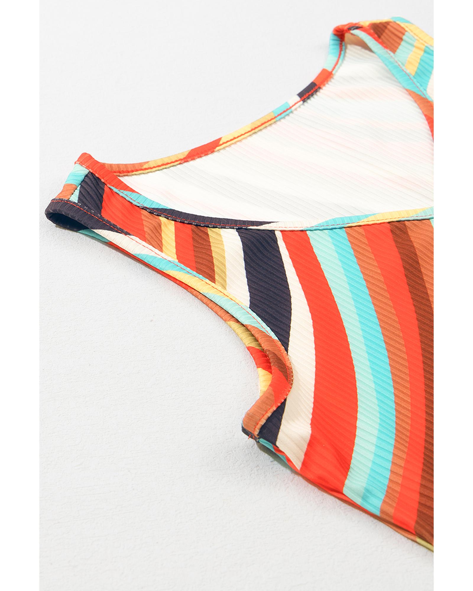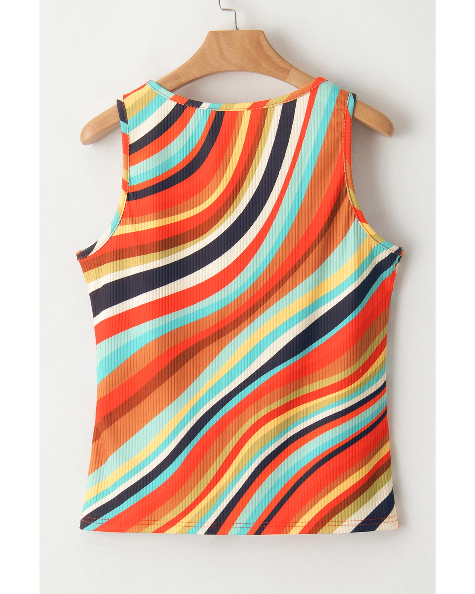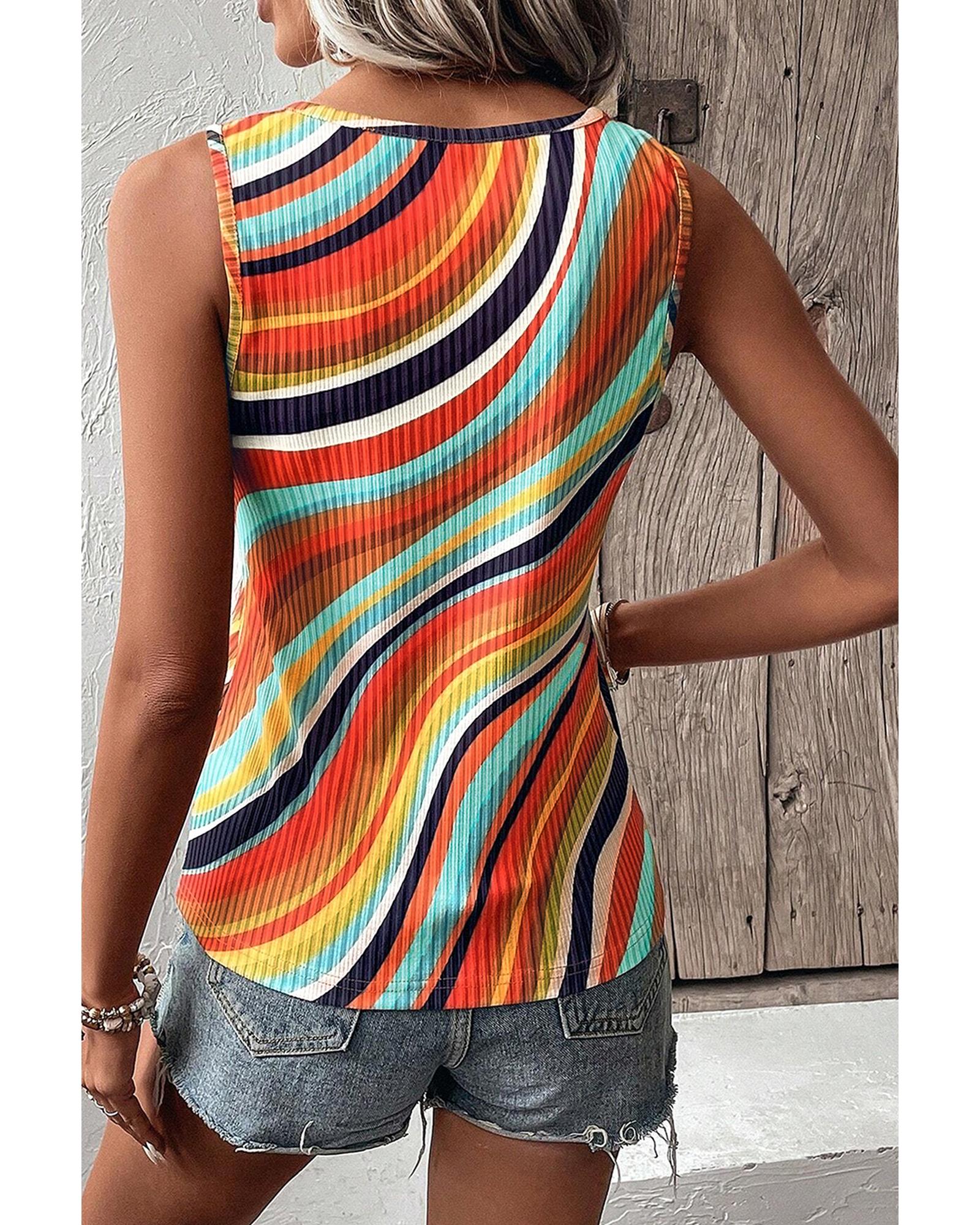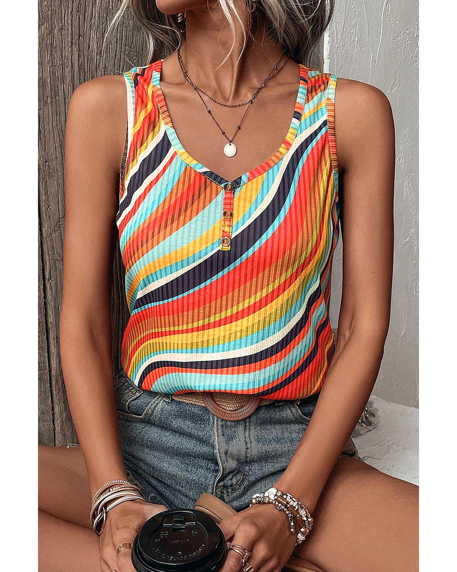This multicolour wavy striped buttoned V-neck tank top features a trendy fitted design that complements a casual and stylish look. Its sleeveless style and vibrant pattern make it a versatile addition to your wardrobe, ideal for pairing with denim shorts or casual bottoms.