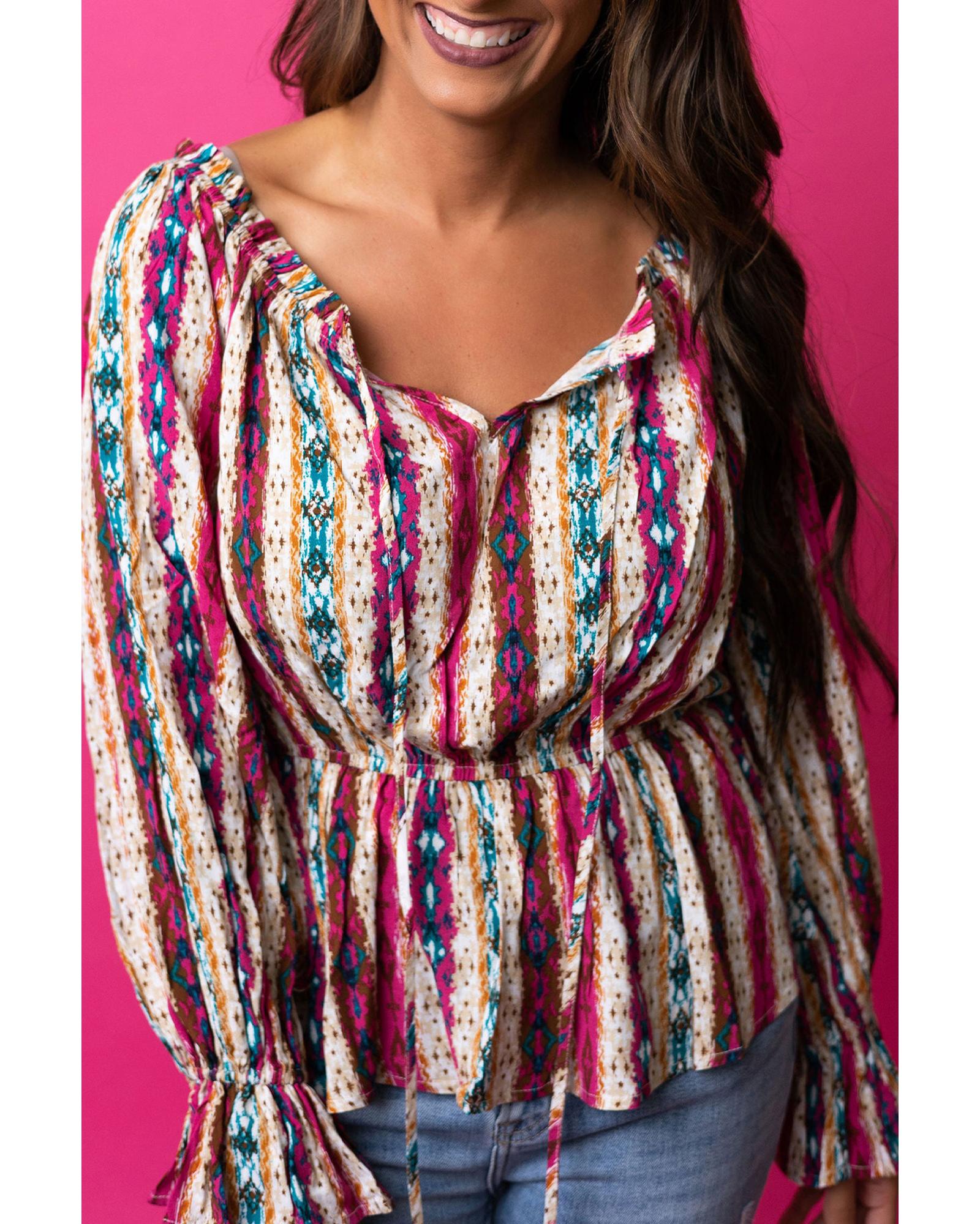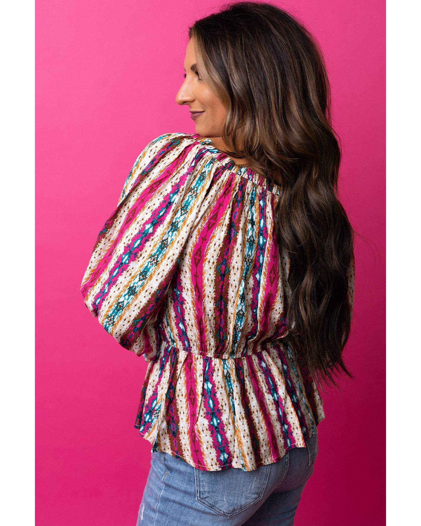 This multicolour Western Aztec split neck peplum blouse features a vibrant pattern and a trendy fitted silhouette. Designed with a feminine touch, it combines style and comfort, making it suitable for various seasons and occasions.