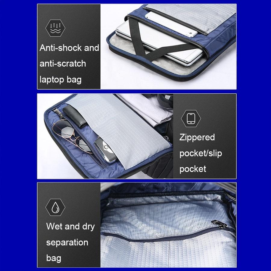 This multifunctional business backpack combines practicality and security, making it ideal for professionals on the go. Crafted from durable microfiber synthetic leather, nylon, and polyester, it offers waterproof and wear-resistant features. The backpack includes an anti-theft design and a load reduction feature, along with a rear trolley case fixing belt for convenient travel.