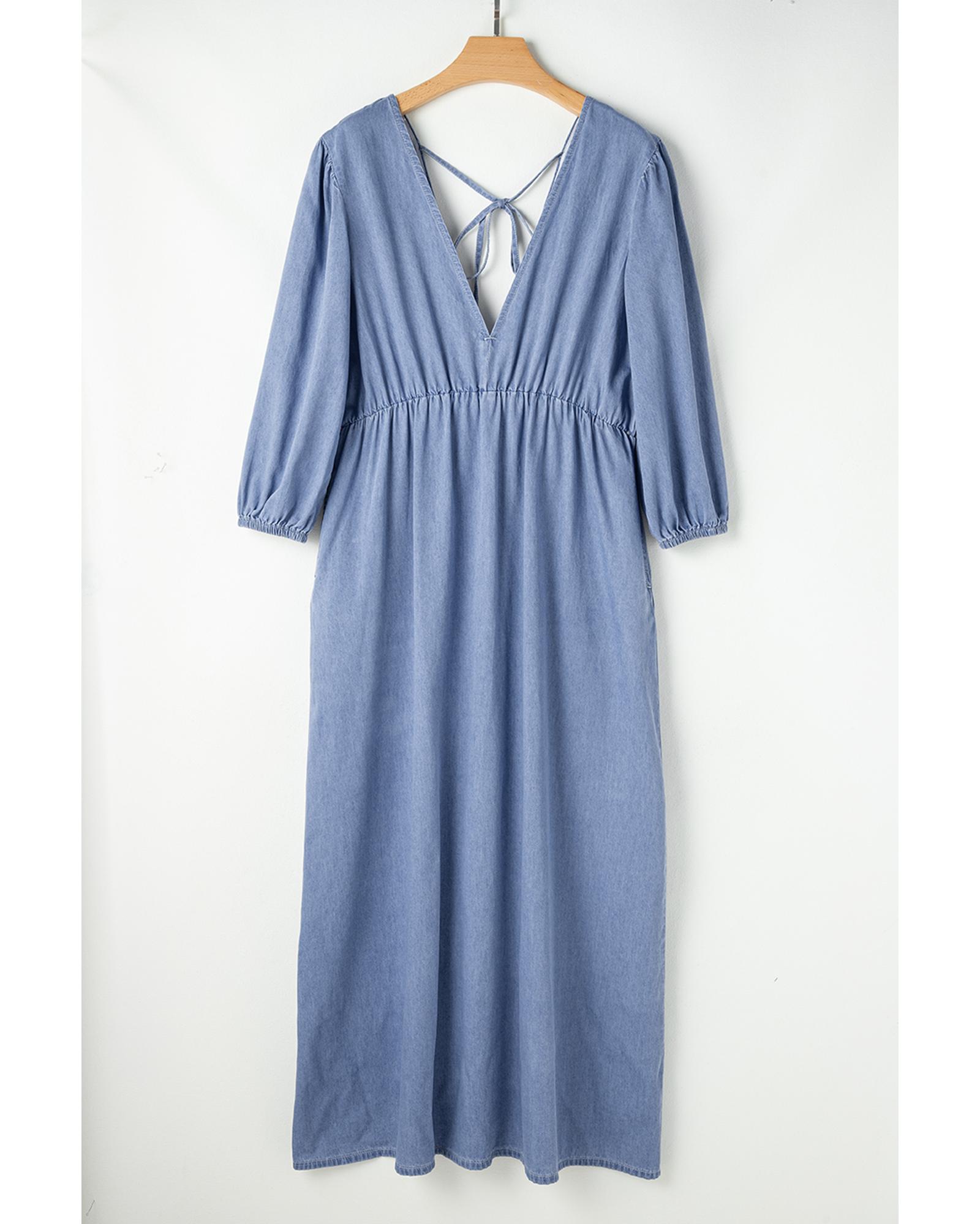 Myosotis Chambray Deep V Neck Bracelet Sleeve Maxi Dress – L