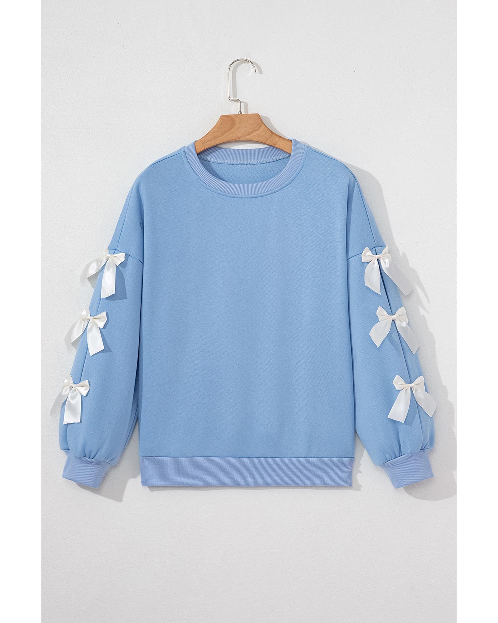 This sweatshirt features a trendy fitted design with a relaxed dropped sleeve style, making it both stylish and comfortable. It is suitable for casual wear and offers a modern look with unique bow and ribbon details on the sleeves.