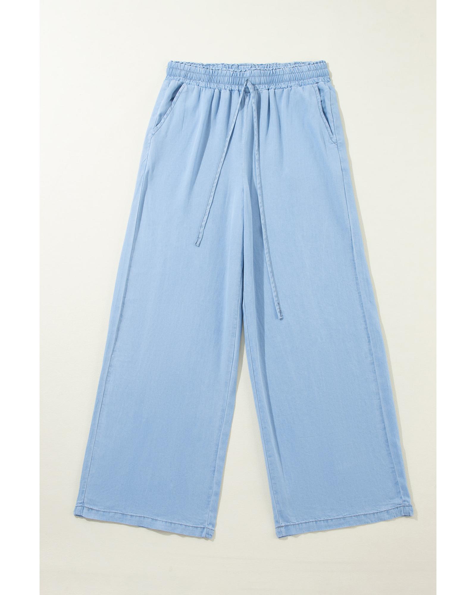 This pair of high waist wide leg denim pants features a trendy and comfortable design suitable for various casual occasions. The adjustable drawstring closure allows for a customized fit, while the high waist silhouette offers a flattering look. Made from durable denim material, these pants combine style and practicality for everyday wear.