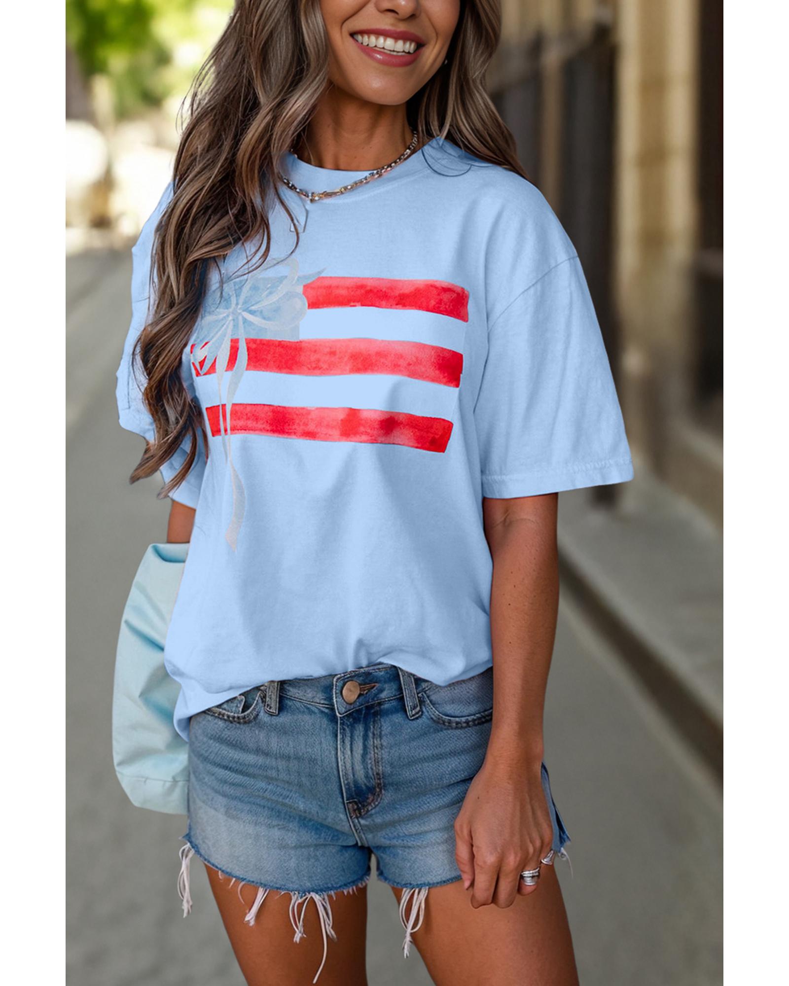 This crewneck tee features a playful and patriotic flag bow graphic, making it a fun addition to your casual wardrobe. Designed with a relaxed fit, it offers comfort for everyday wear. The eye-catching pink color adds a vibrant touch, and it pairs well with pants, jeans, denim shorts, and skirts.