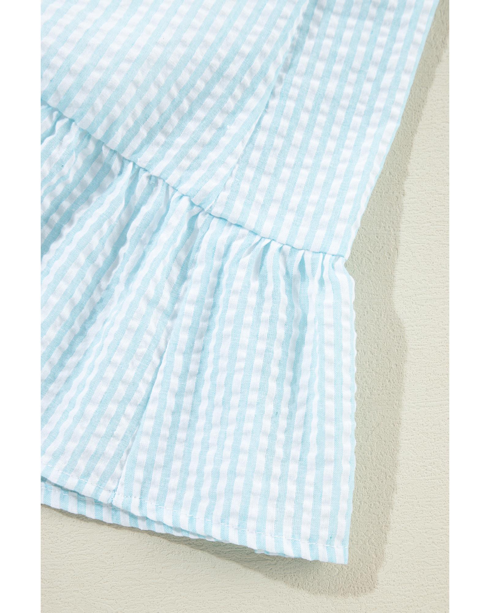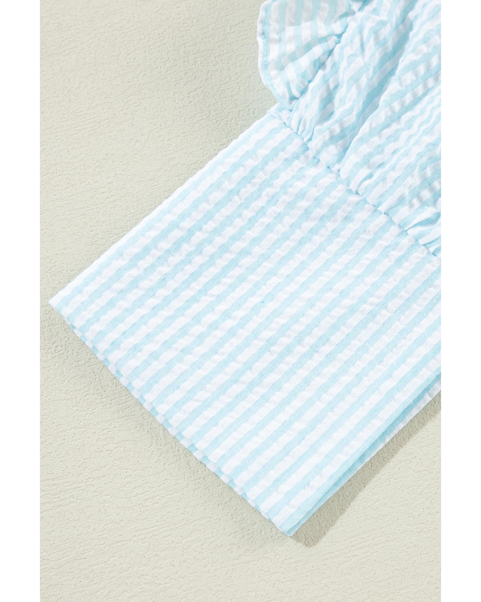 Myosotis Seersucker Ruffled Puff Sleeve Stand Neck Mini Dress – S