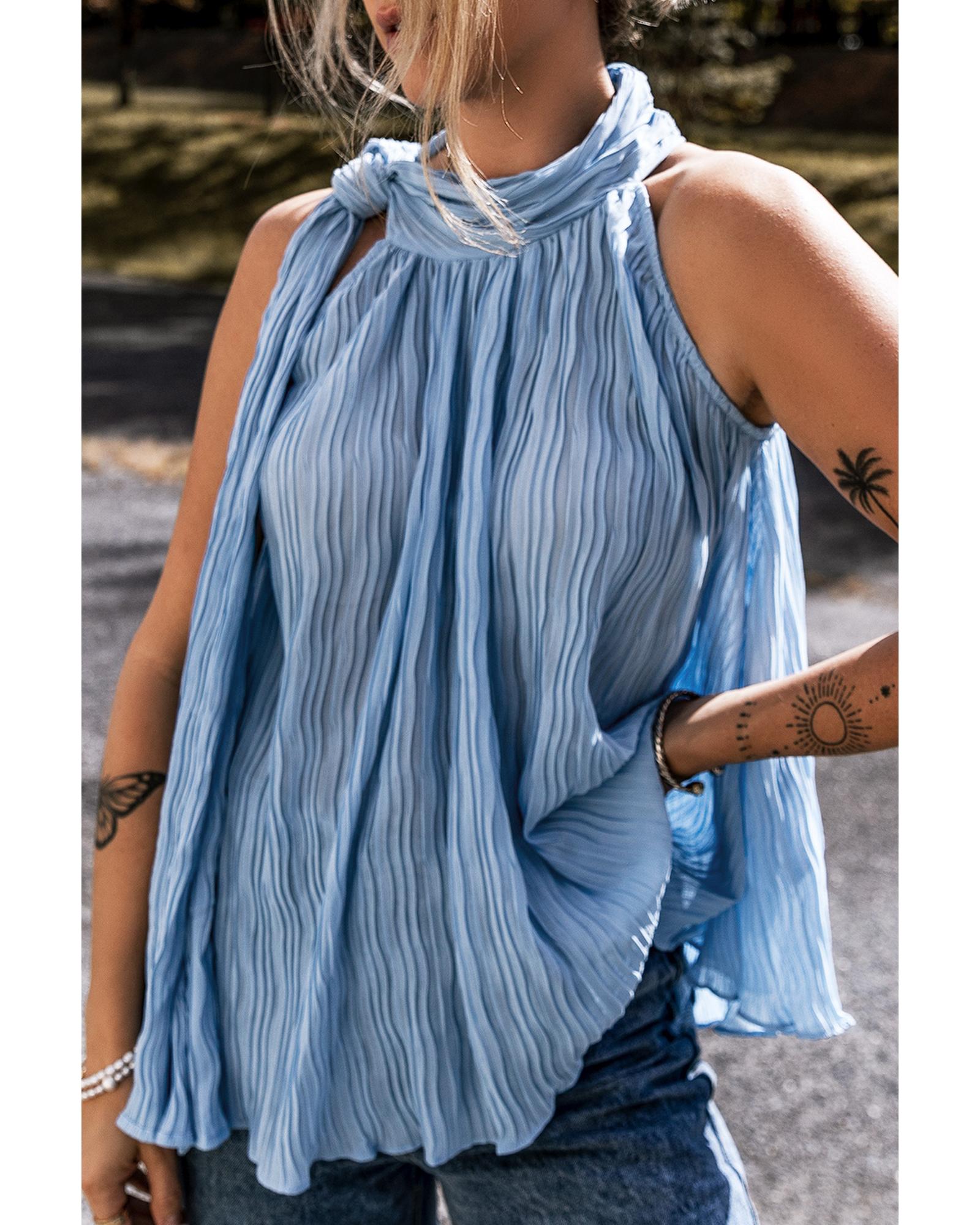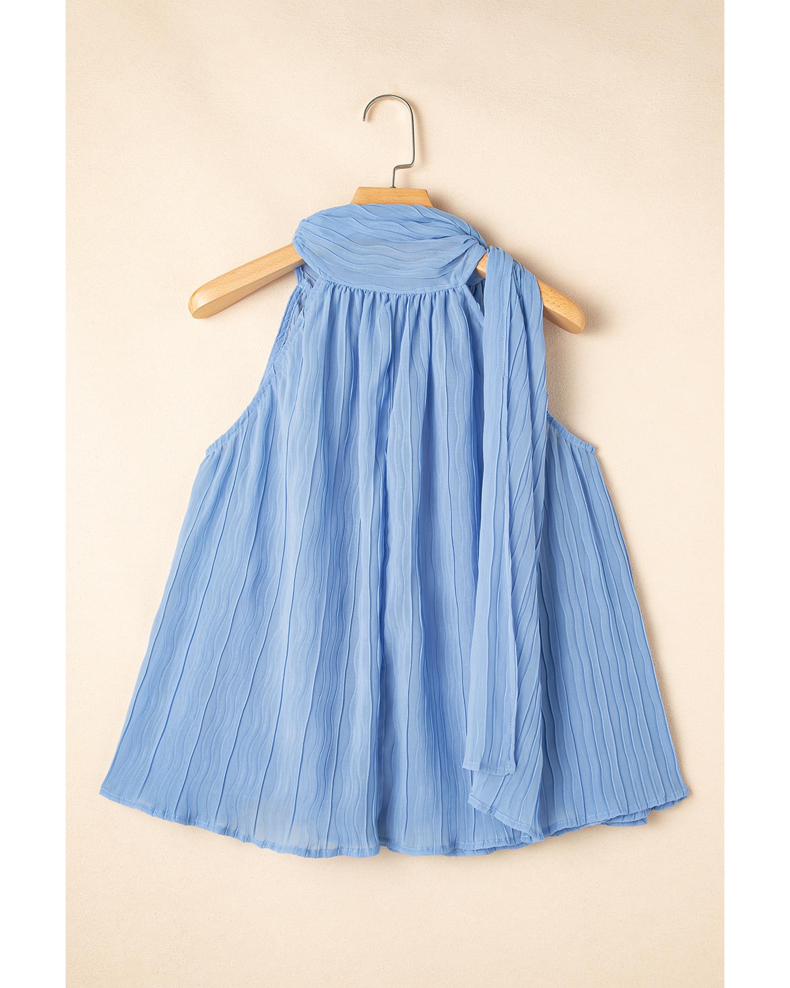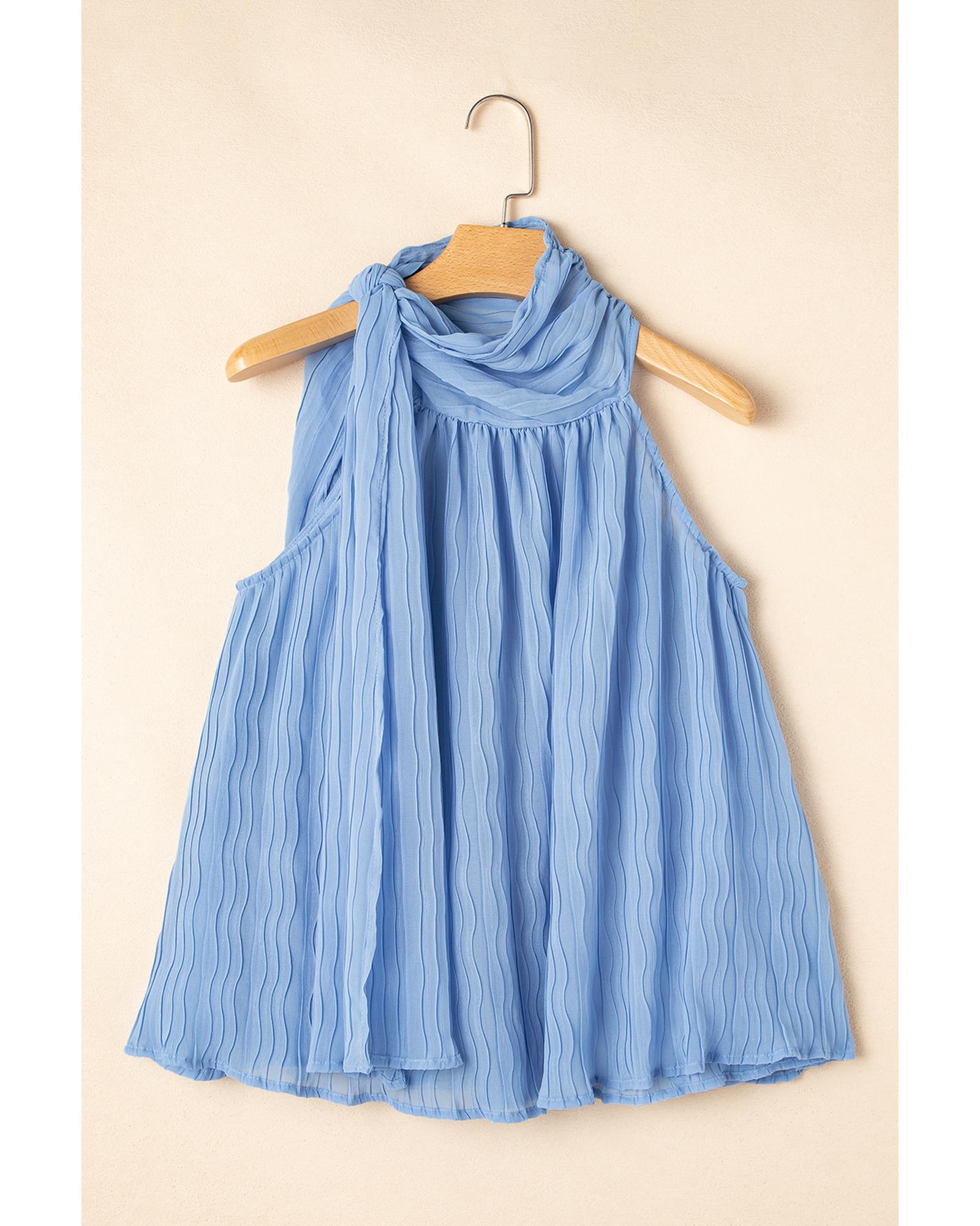 This flowy tank top features a textured fabric and pleated details that create a flattering silhouette. The tied mock neck adds a chic and trendy touch, making it suitable for various casual and stylish outfits. Designed for comfort and elegance, it offers a breezy wearing experience.