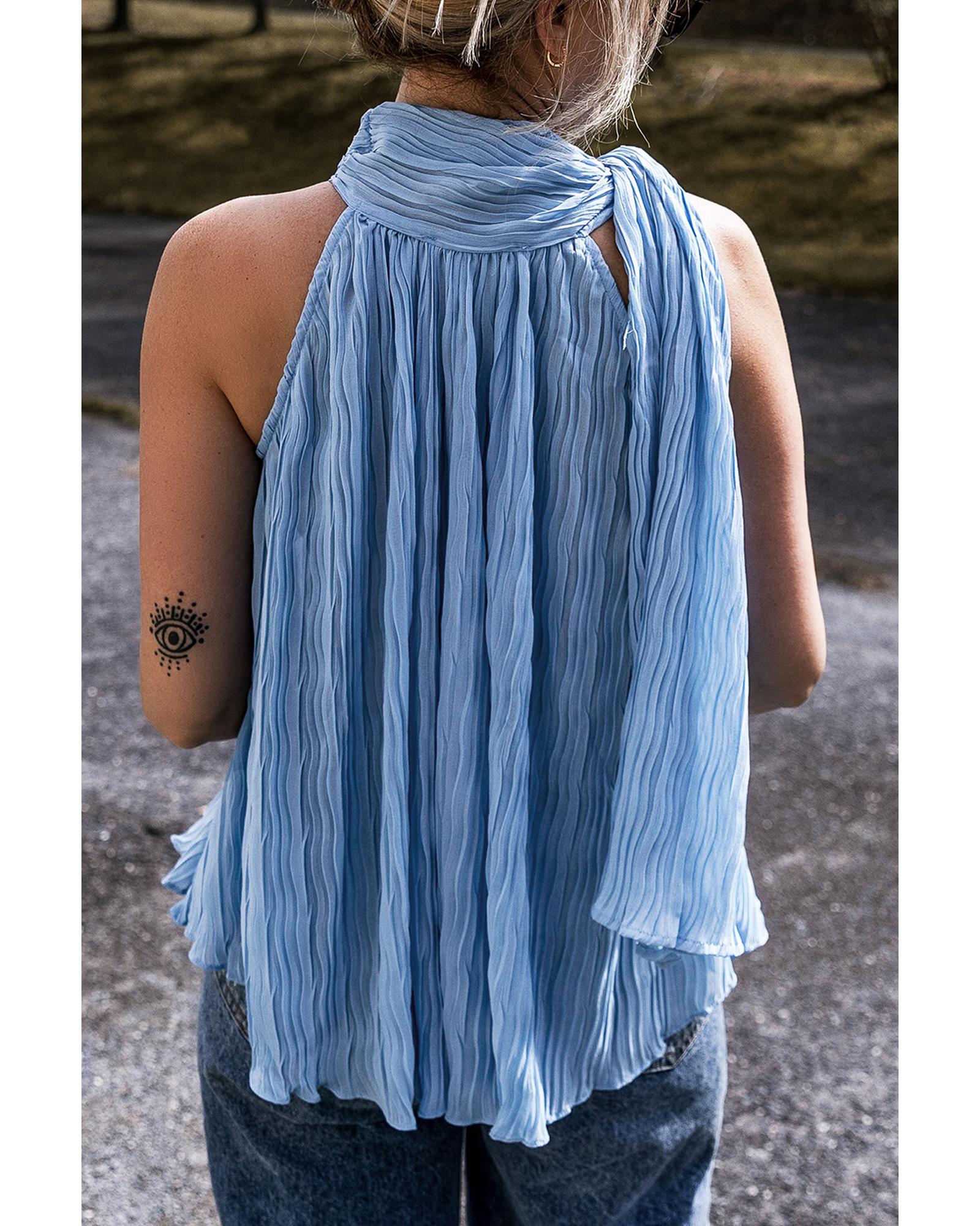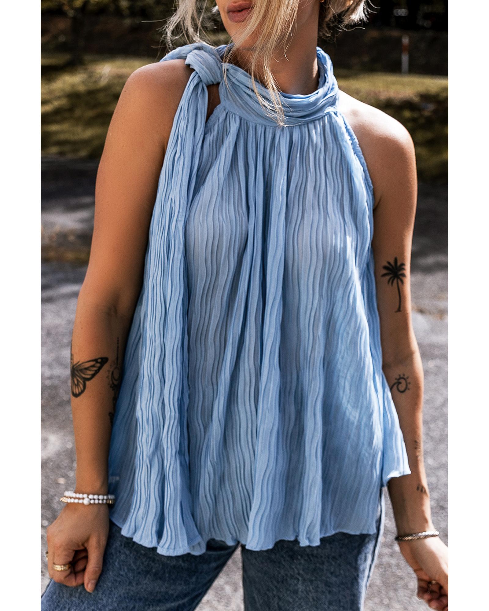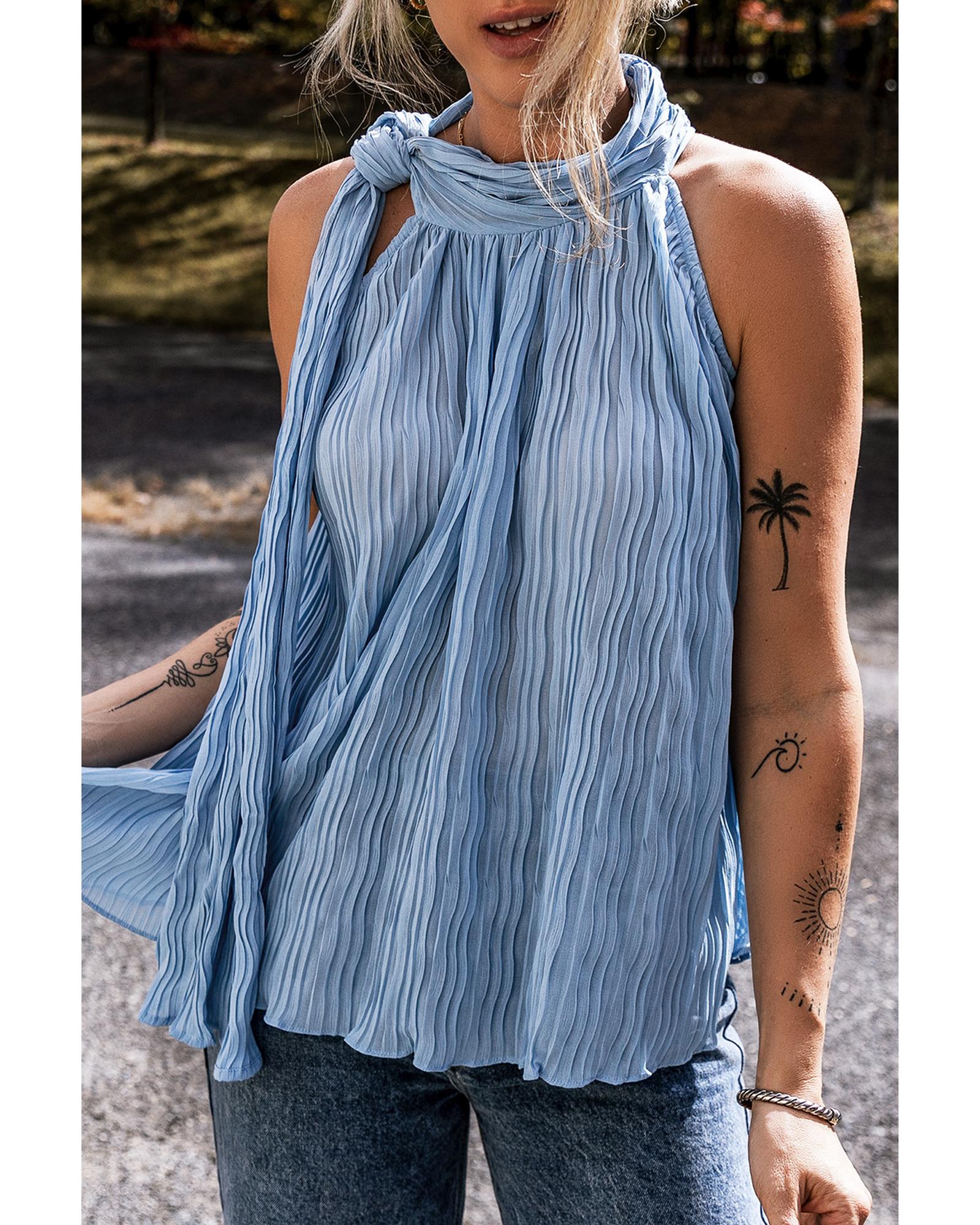 This flowy tank top features a textured fabric and pleated details that create a flattering silhouette. The tied mock neck adds a chic and trendy touch, making it suitable for various casual and stylish outfits. Designed for comfort and elegance, it offers a breezy wearing experience.