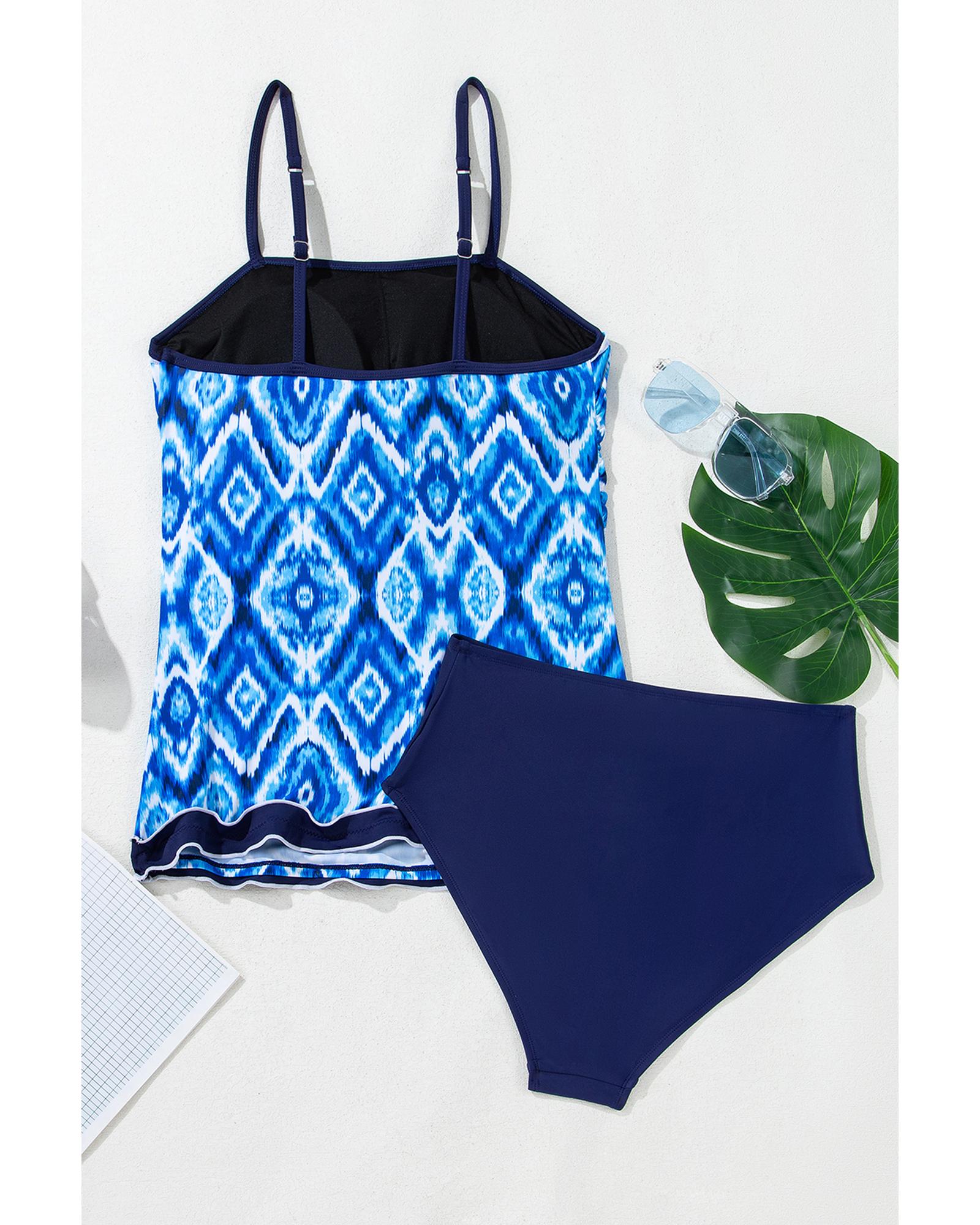 Navy Blue Abstract Print Frilled Trim Spaghetti Straps Tankini Set – M