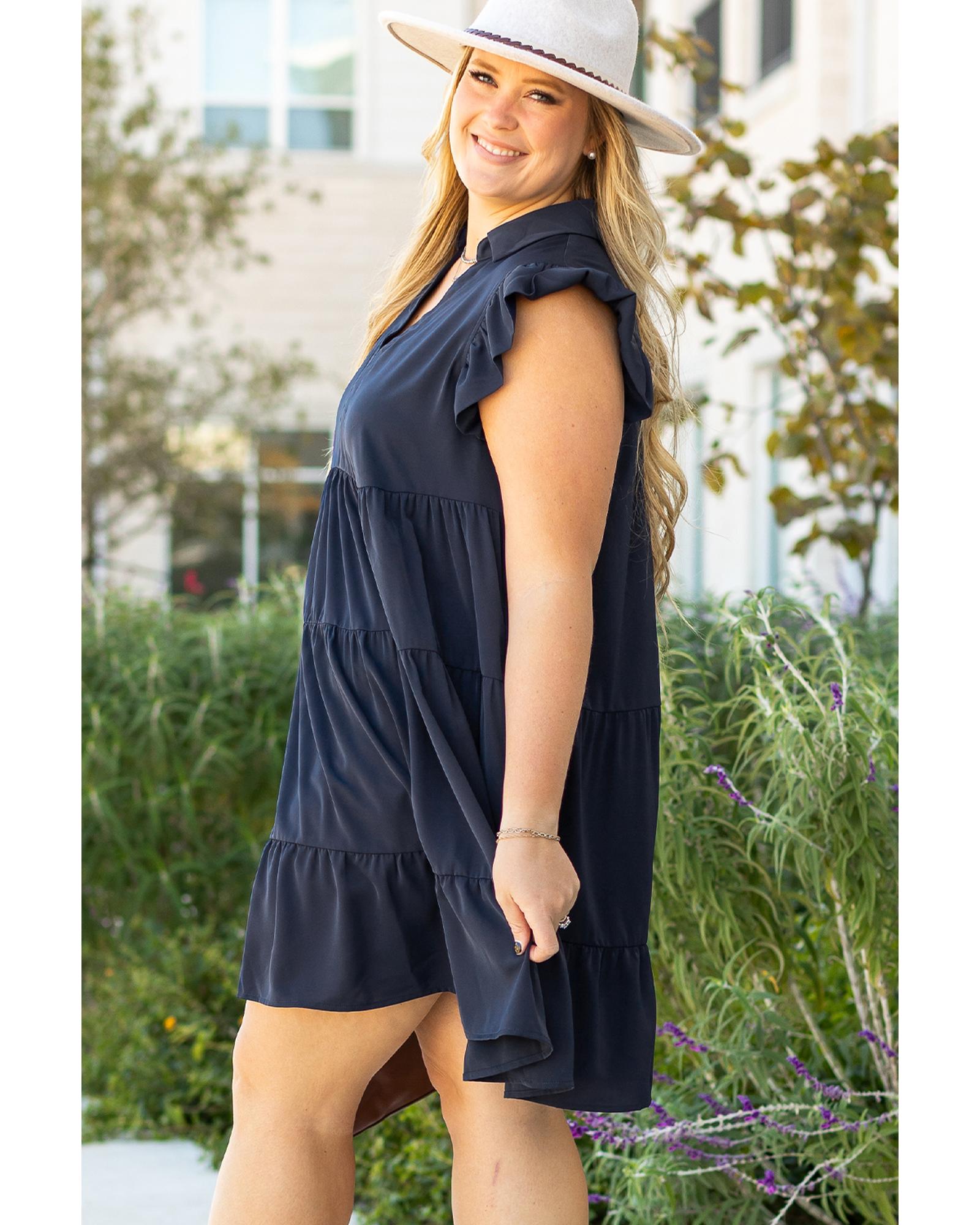 Navy Blue Collared V Neck Flutter Sleeve Tiered Plus Size Dress – 1X