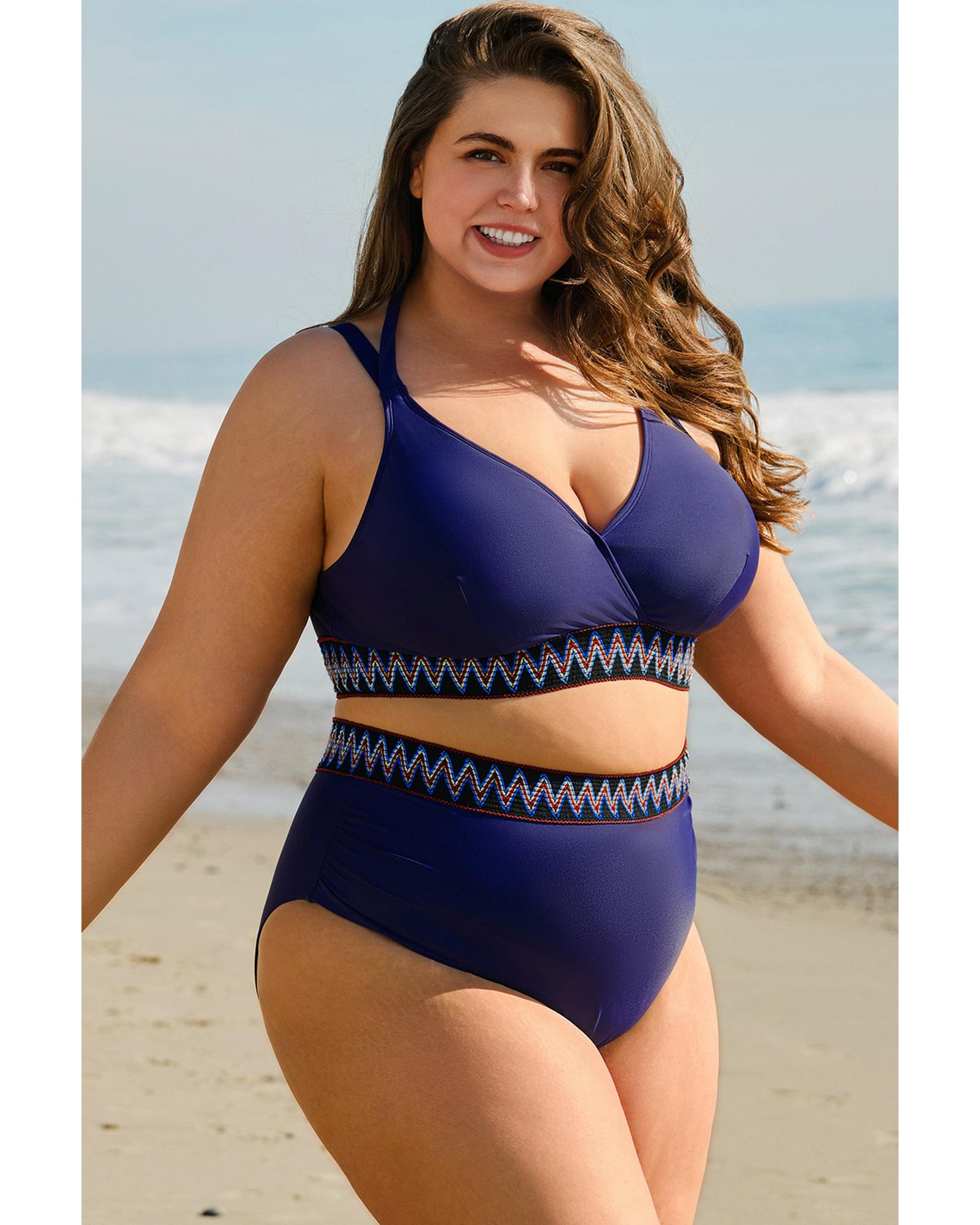This high-waisted bikini features a stylish wrap tie knot design and embroidered trim, offering a fashionable and flattering look. The top has a wrap V-neck style, providing both comfort and support. Designed for plus sizes, it combines chic details with functional features for an enhanced beachwear experience.