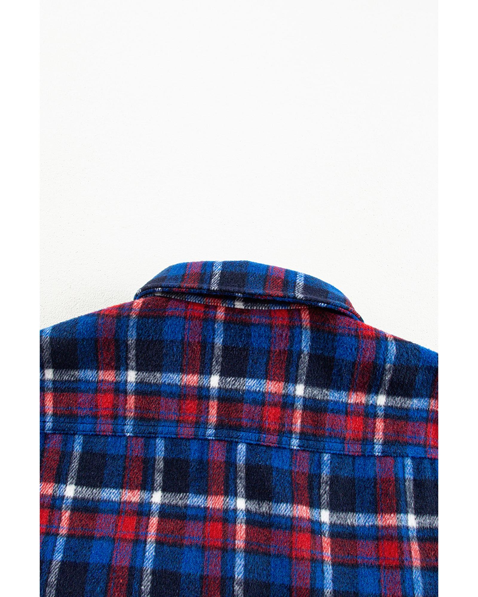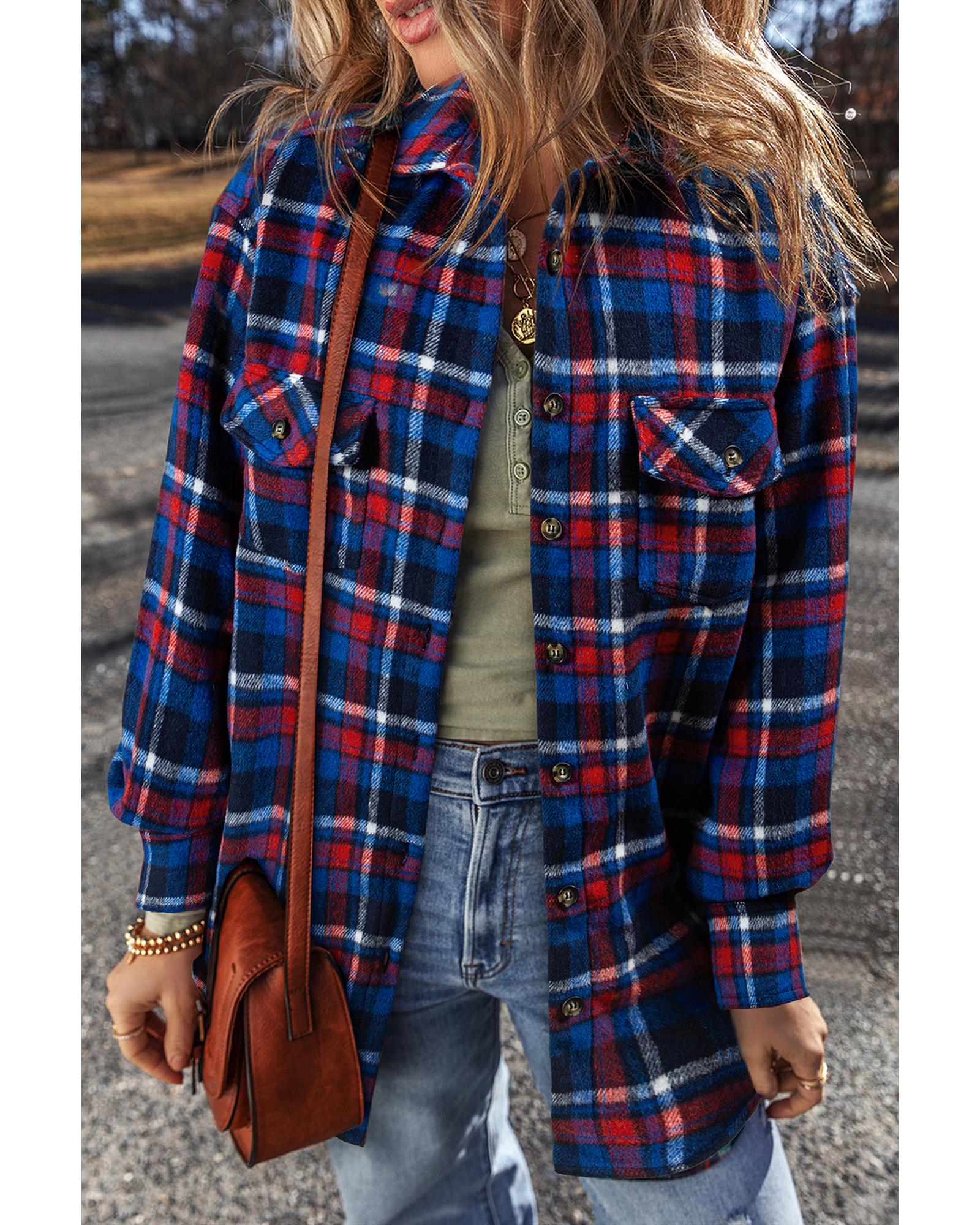 This navy blue plaid shacket features a classic design with a versatile style suitable for both casual and formal occasions. It offers a trendy fitted look and customizable fit with button-up closure, making it a stylish addition to any wardrobe.