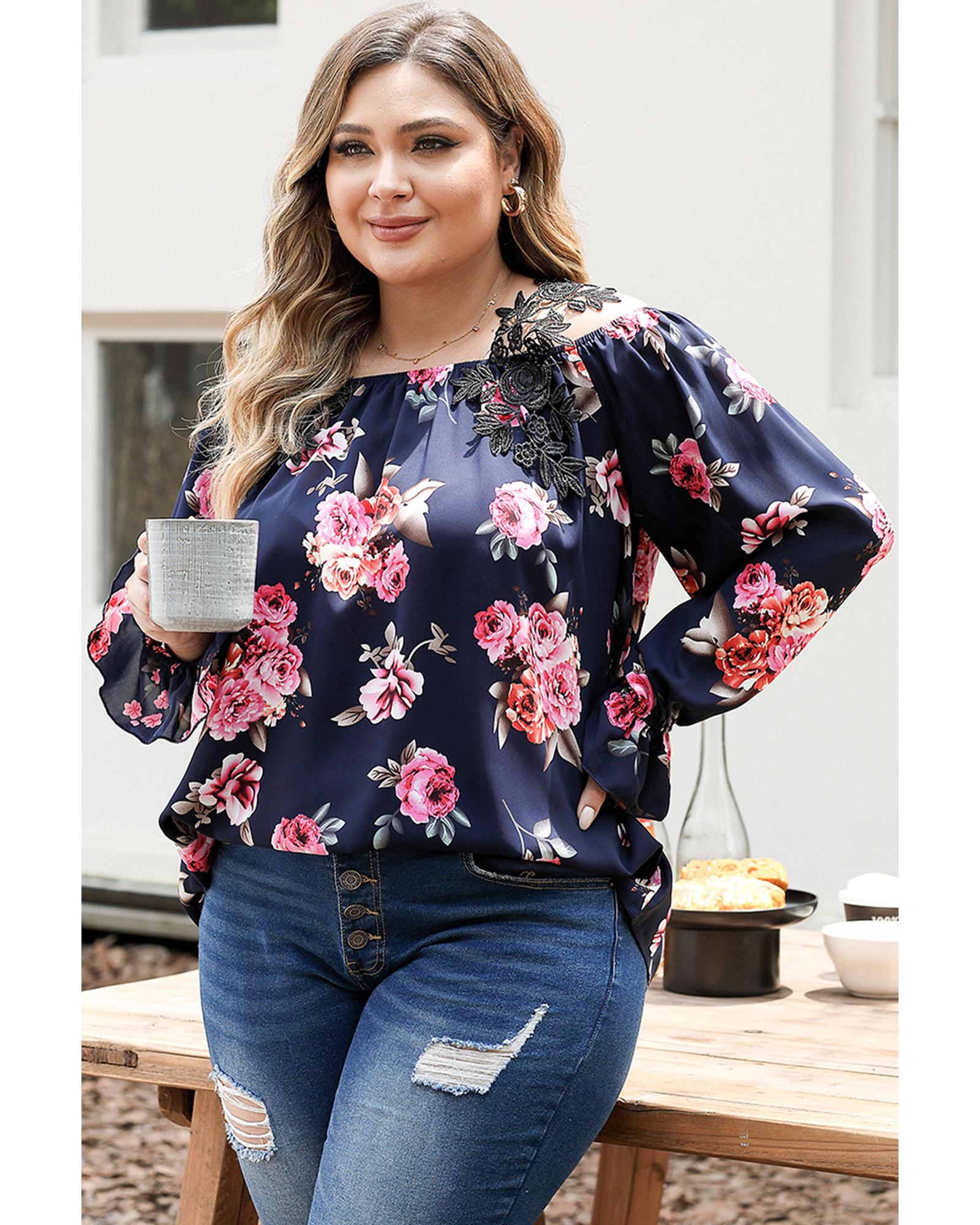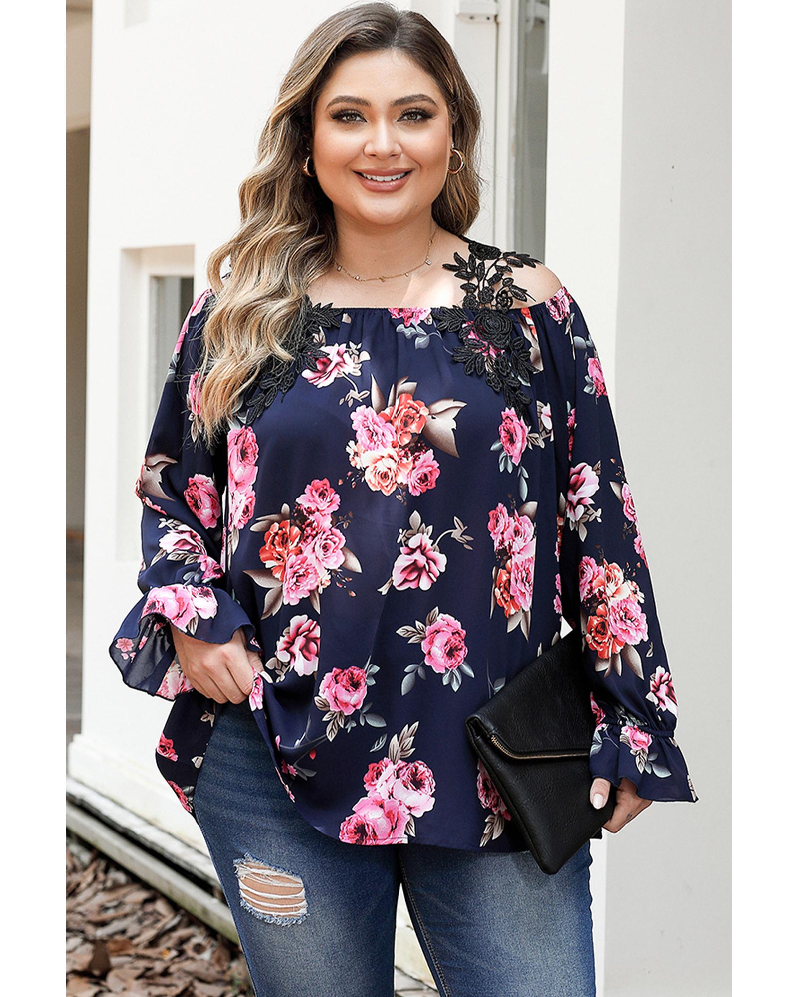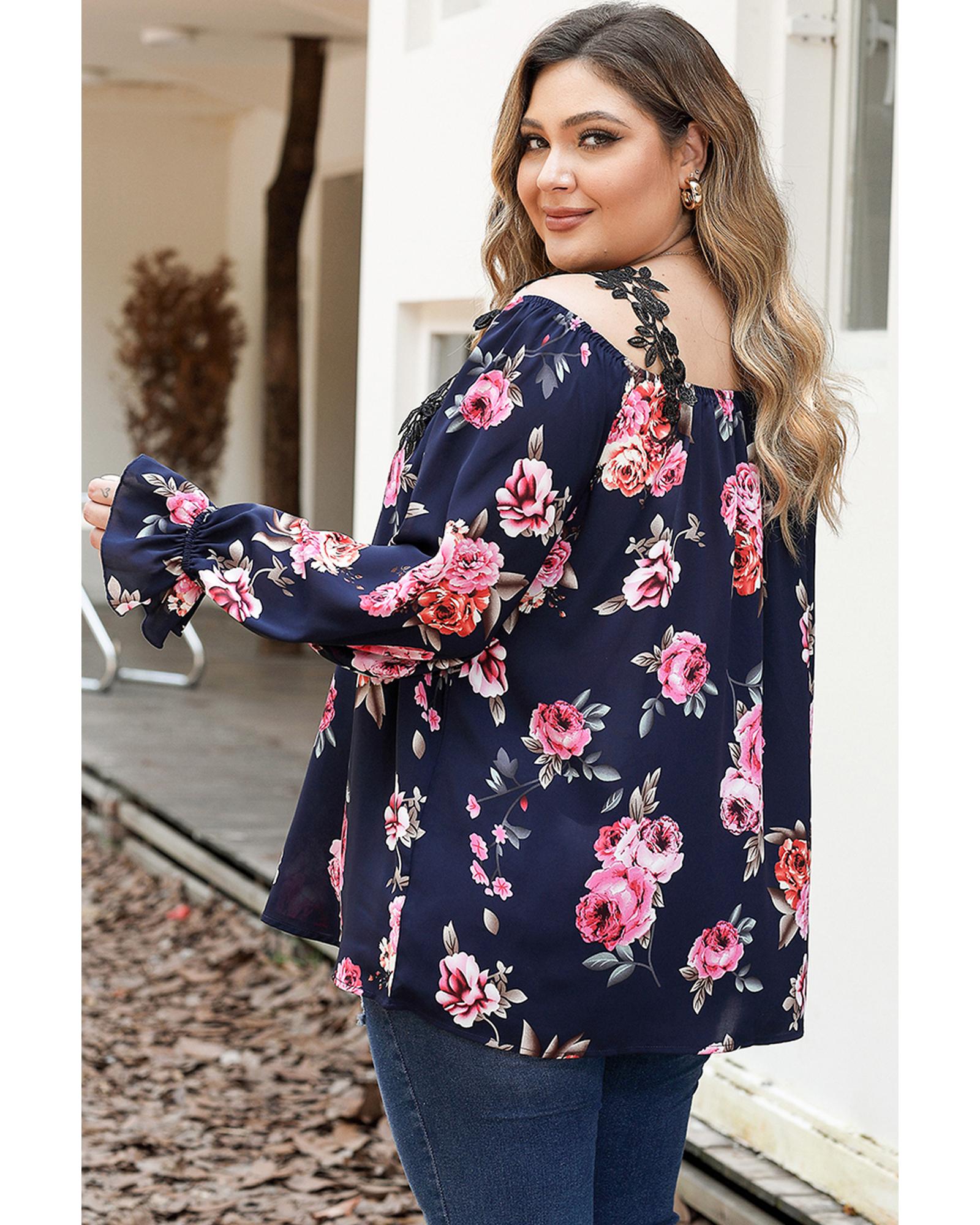 Navy Blue Plus Size Crochet Detail Cold shoulder Floral Blouse – 2X