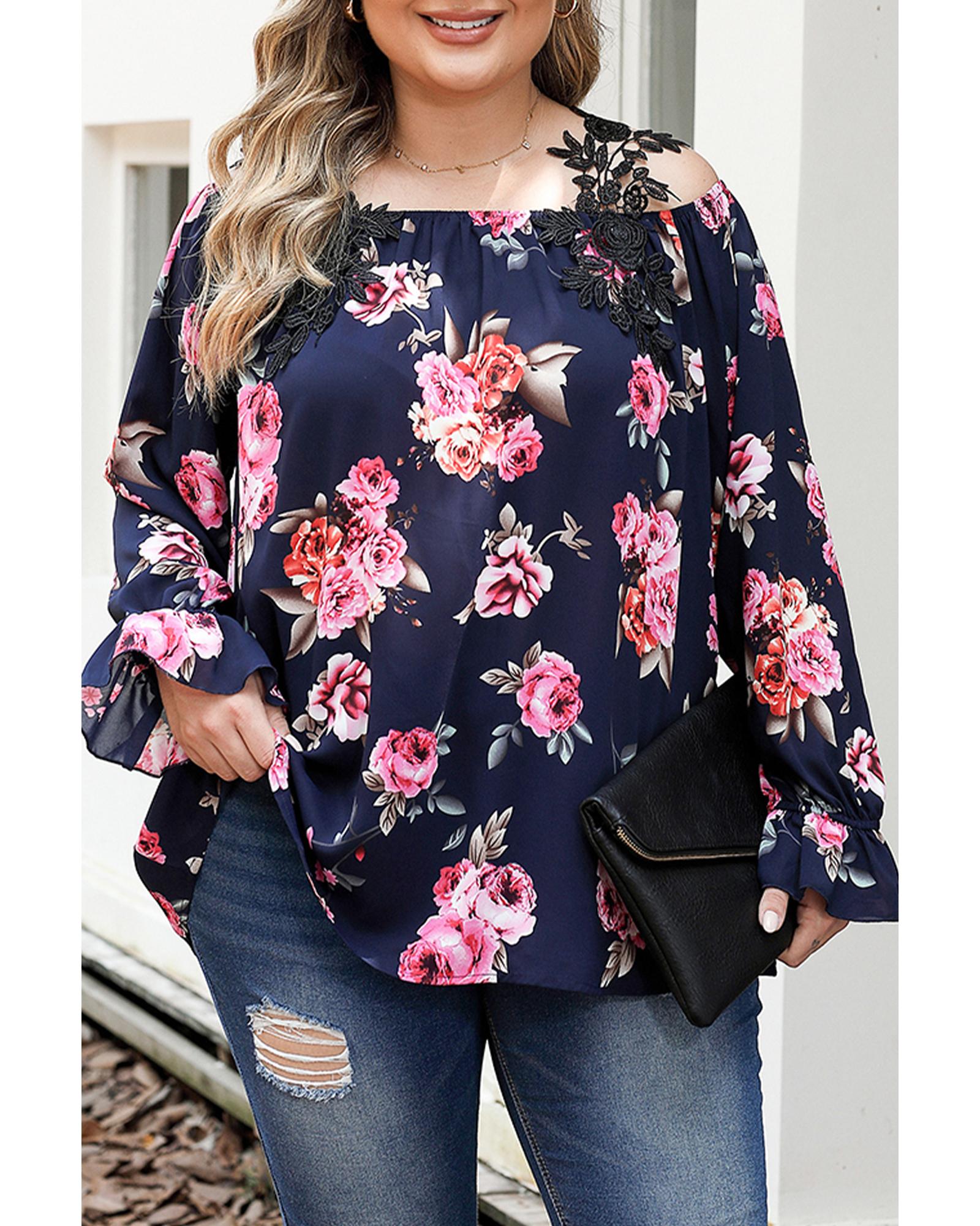 Package Content: 1 x Plus Size Crochet Detail Cold Shoulder Floral Blouse
