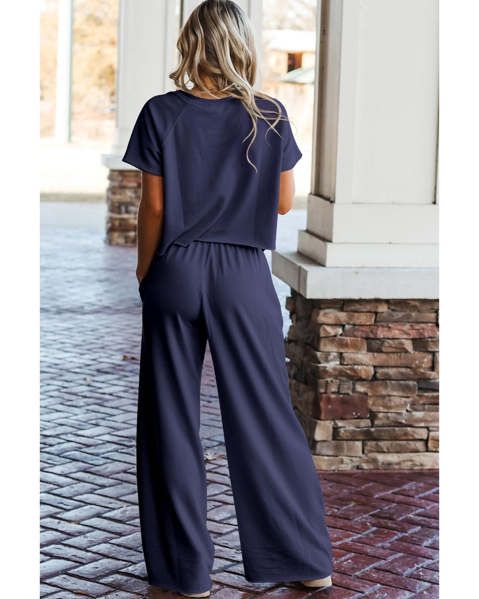 This set features a navy blue raw hem loose tee paired with wide-leg pants, creating a stylish and comfortable look. The raw hem detail adds a touch of edge, while the raglan sleeves on the tee enhance its casual appeal. The wide-leg pants come with an elastic waistband for a flexible fit, making it suitable for various casual occasions. The high elasticity fabric ensures comfort throughout the day.