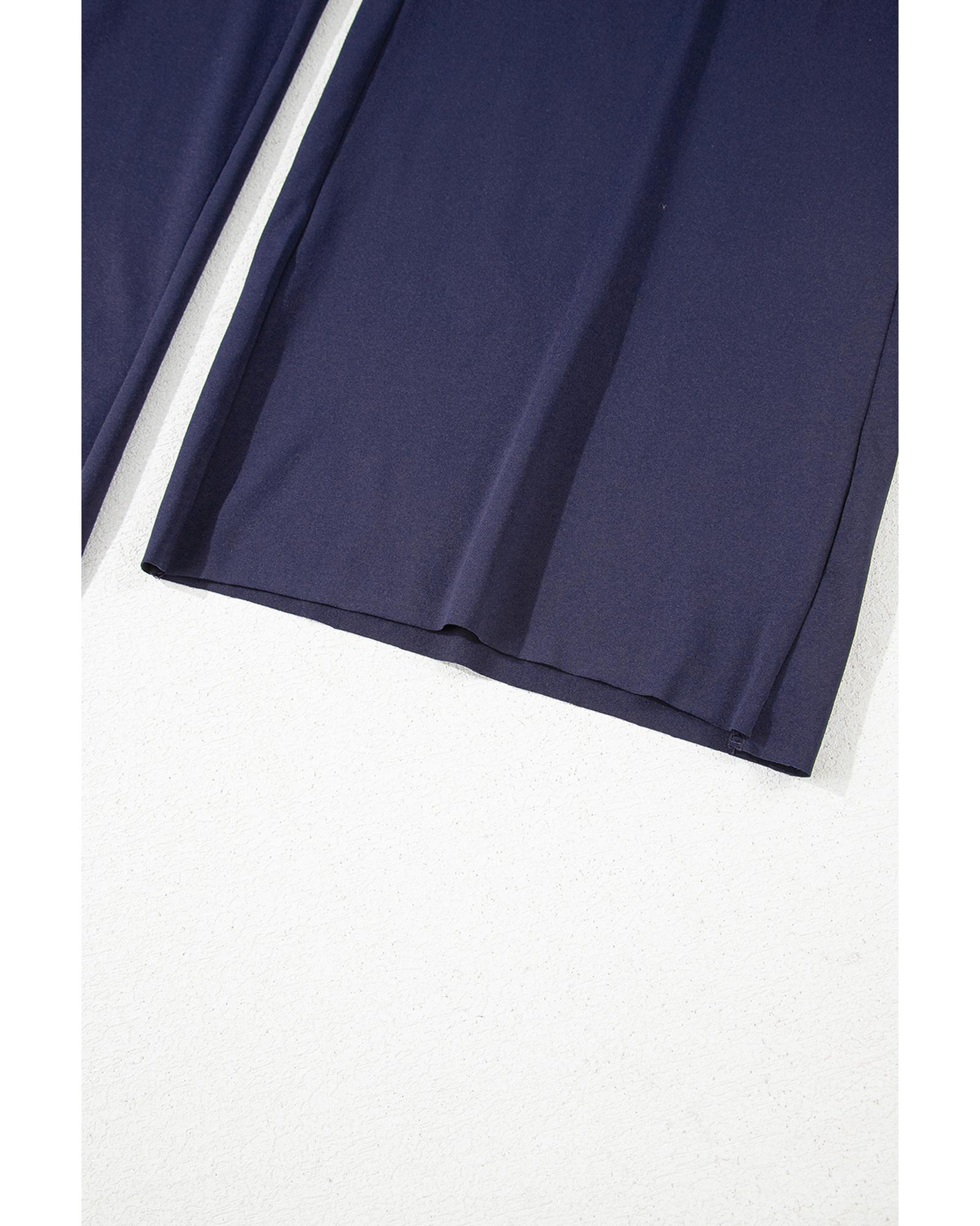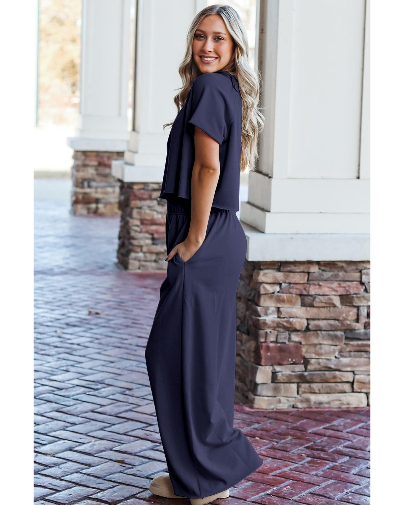 Navy Blue Raw Hem Loose Tee and Wide Leg Pants Set – L
