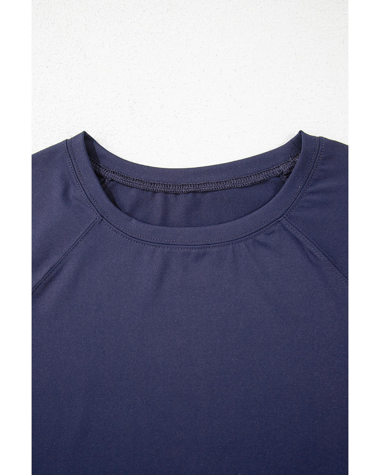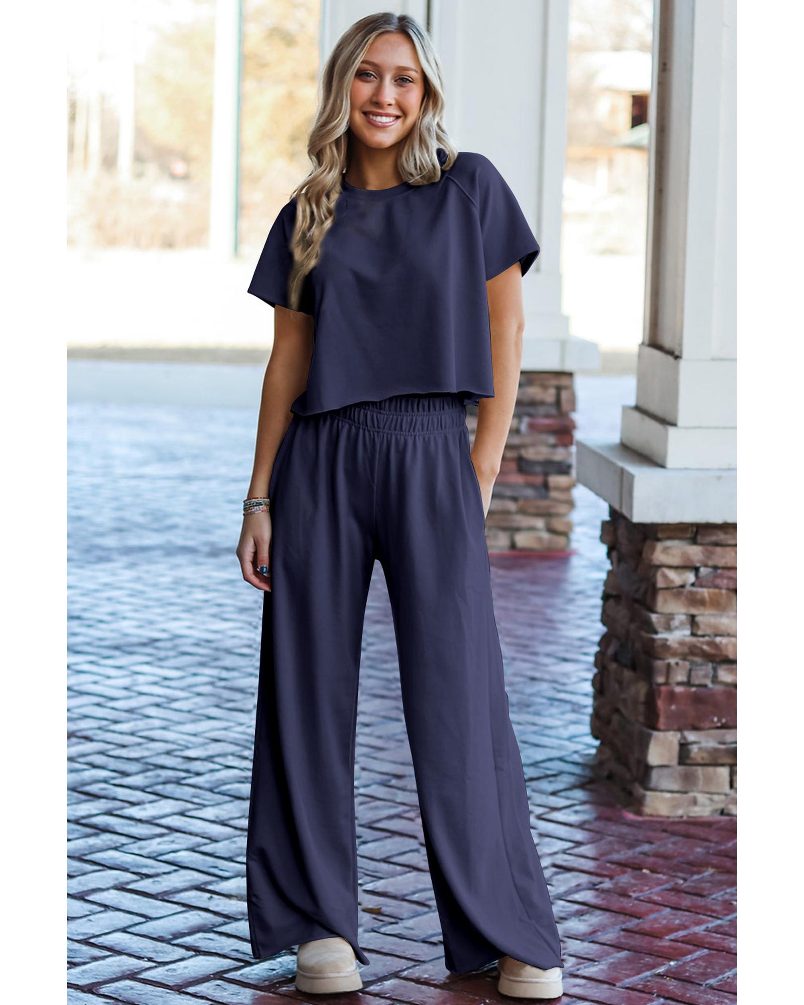 This set includes a navy blue raw hem loose tee and wide-leg pants, offering a stylish and comfortable outfit option. The raw hem detailing adds a touch of edge, while the raglan sleeves on the tee enhance its casual appeal. The wide-leg pants feature an elastic waist for a flexible fit, making it suitable for various casual occasions. The high elasticity fabric ensures comfort throughout the day.