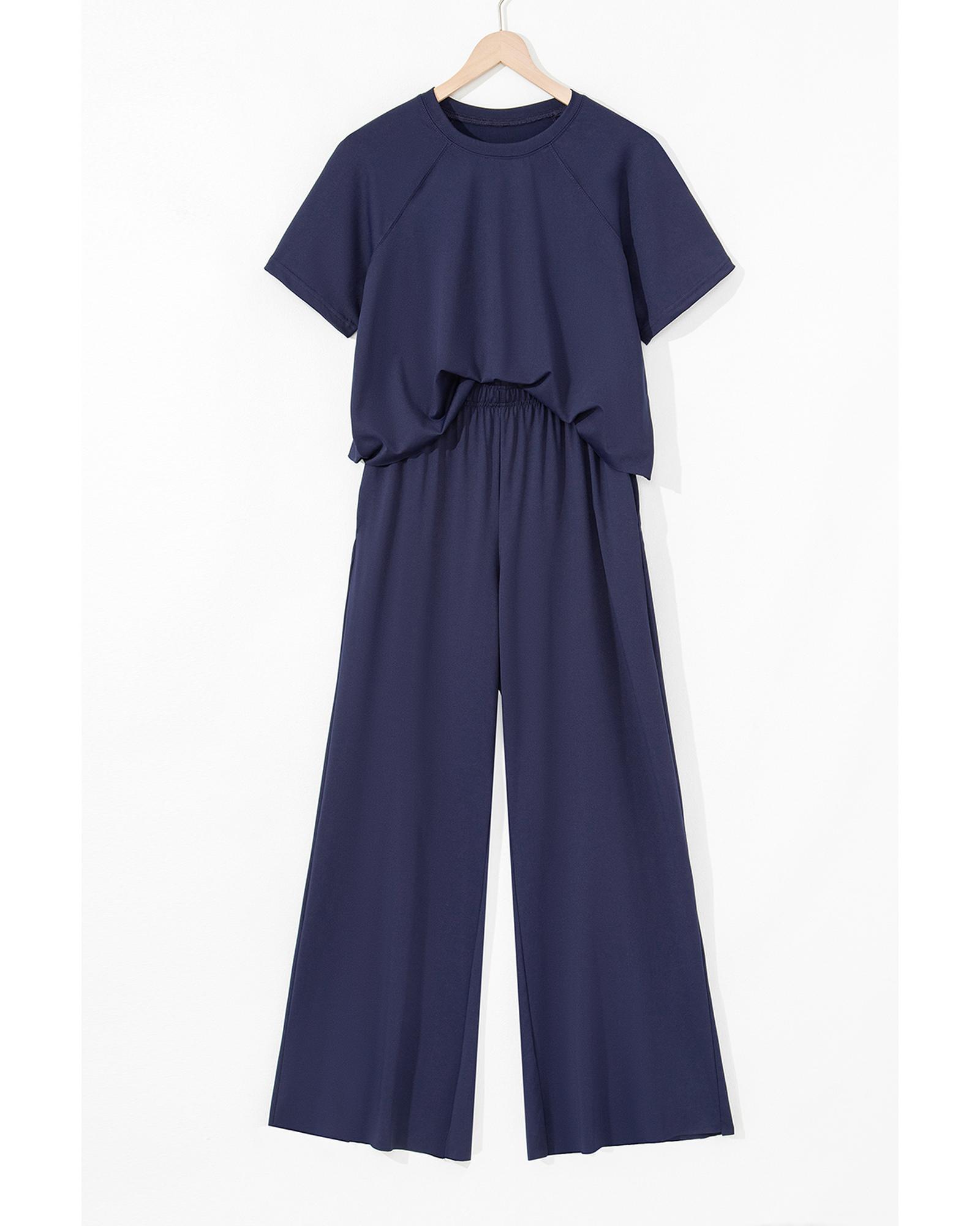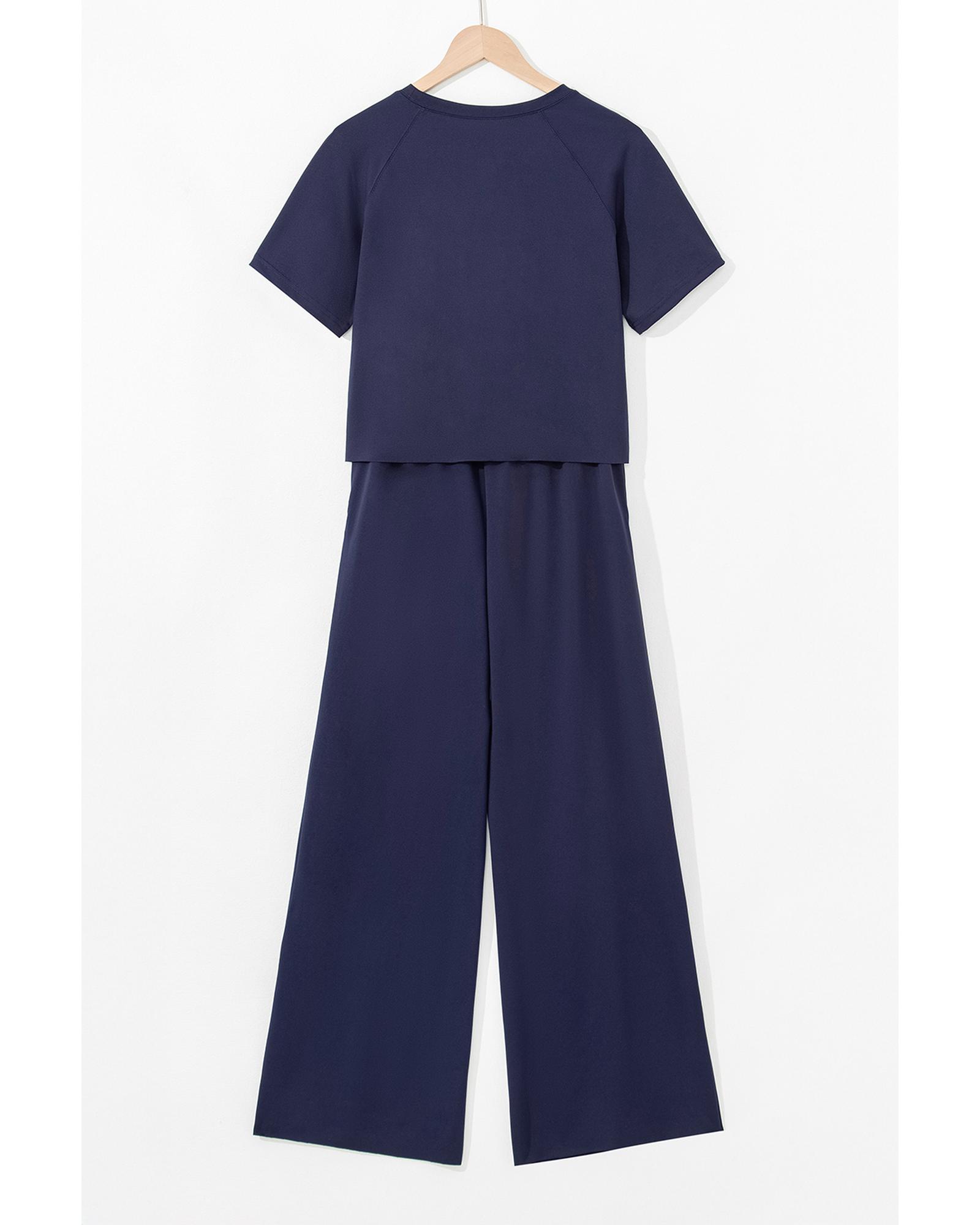 Navy Blue Raw Hem Loose Tee and Wide Leg Pants Set – M