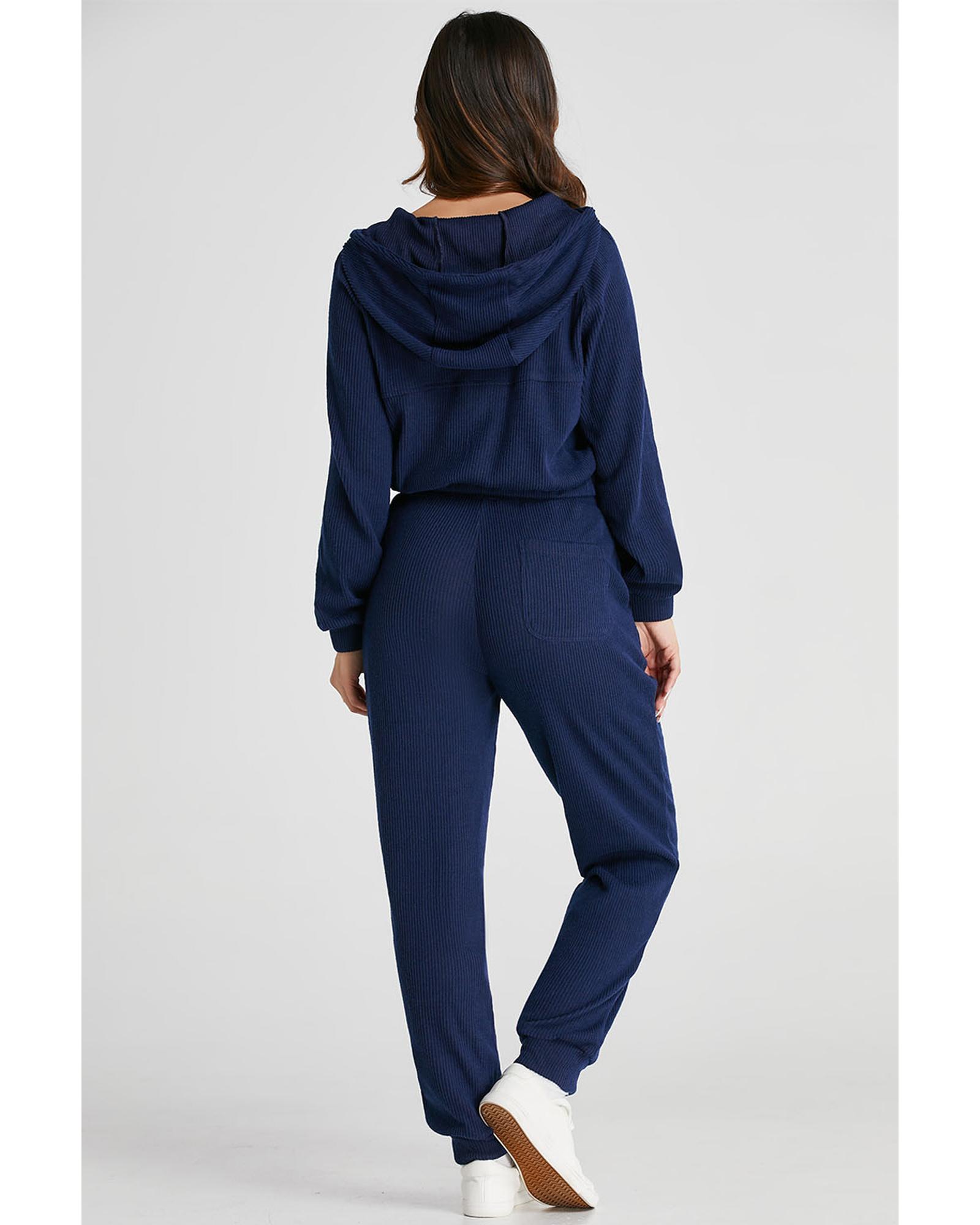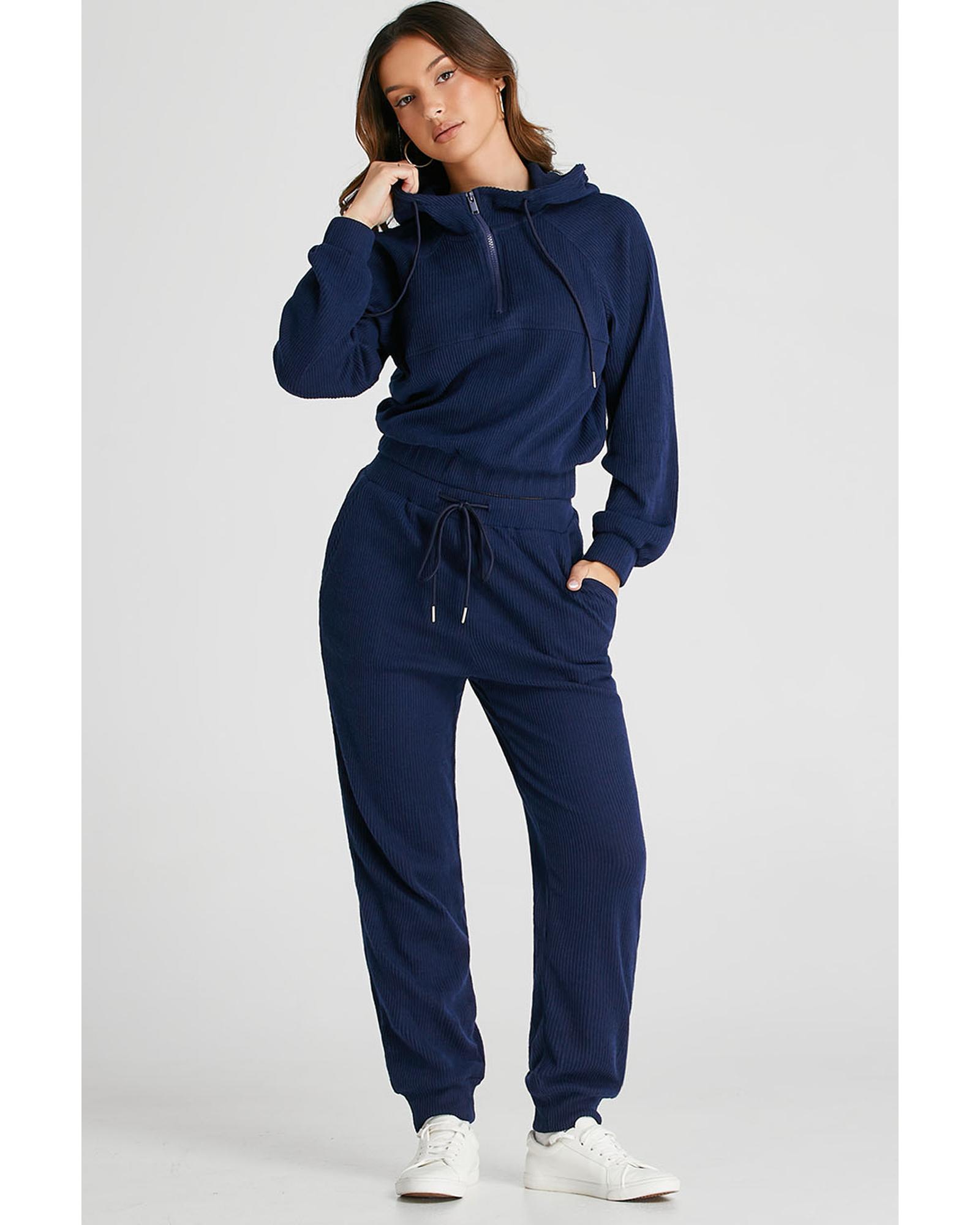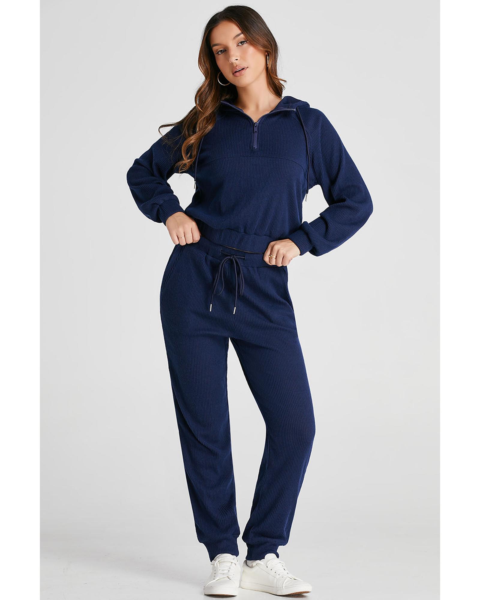 This stylish set features a coordinated navy blue ribbed knit cropped hoodie and drawstring joggers, designed for a trendy and fitted look. Made from a comfortable fabric blend, it is suitable for both workouts and casual wear, offering a textured appearance and a customizable fit with an adjustable waist drawstring.