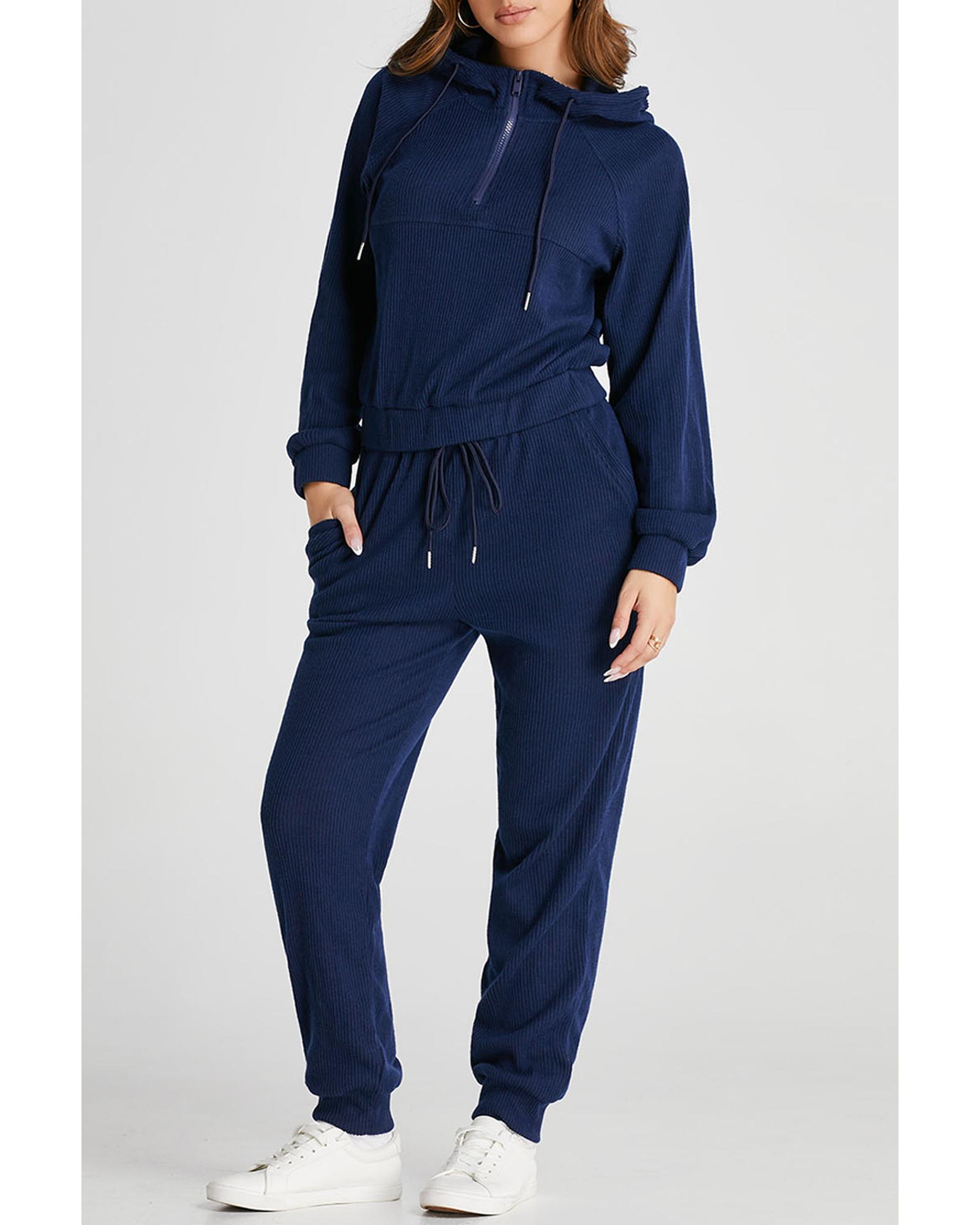 This stylish set features a coordinated navy blue ribbed knit cropped hoodie and drawstring joggers, designed for a trendy and fitted look. Made from a comfortable fabric blend, it is suitable for both casual wear and workouts, offering a textured appearance and a customizable fit with an adjustable waistband.
