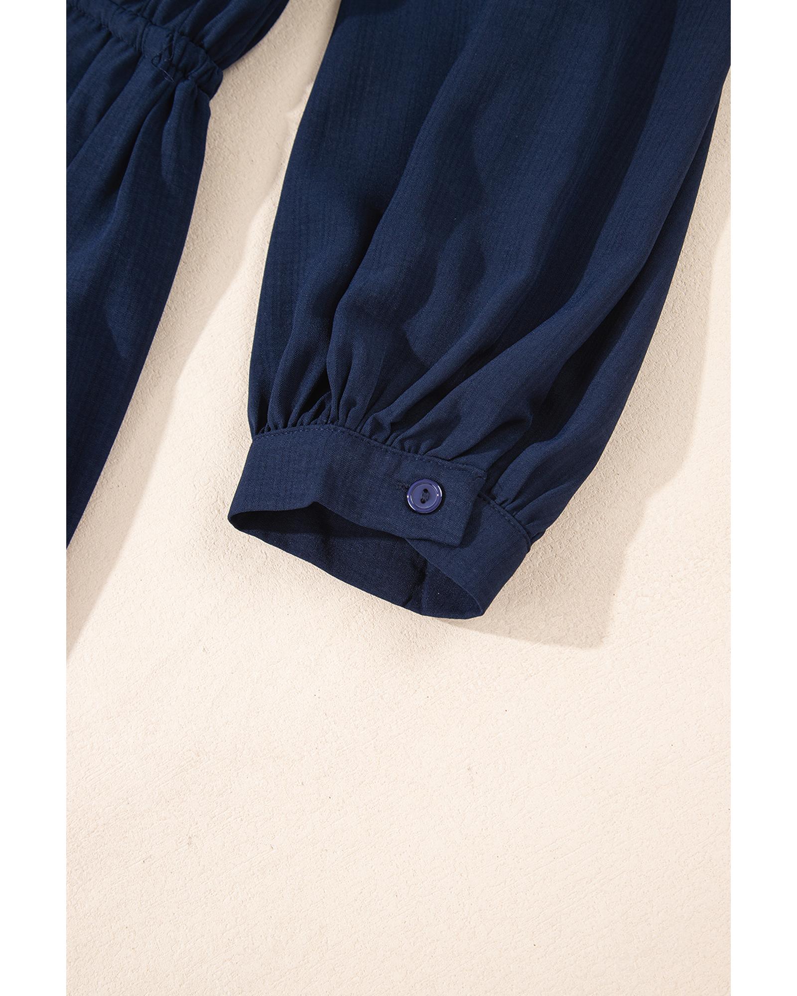 This navy blue tunic shirt mini dress features a versatile and stylish design with a solid color and chest pockets. Its flattering silhouette and tunic style make it suitable for both casual and dressed-up looks. Crafted from high-quality, breathable fabric, it offers comfort and a trendy fit.