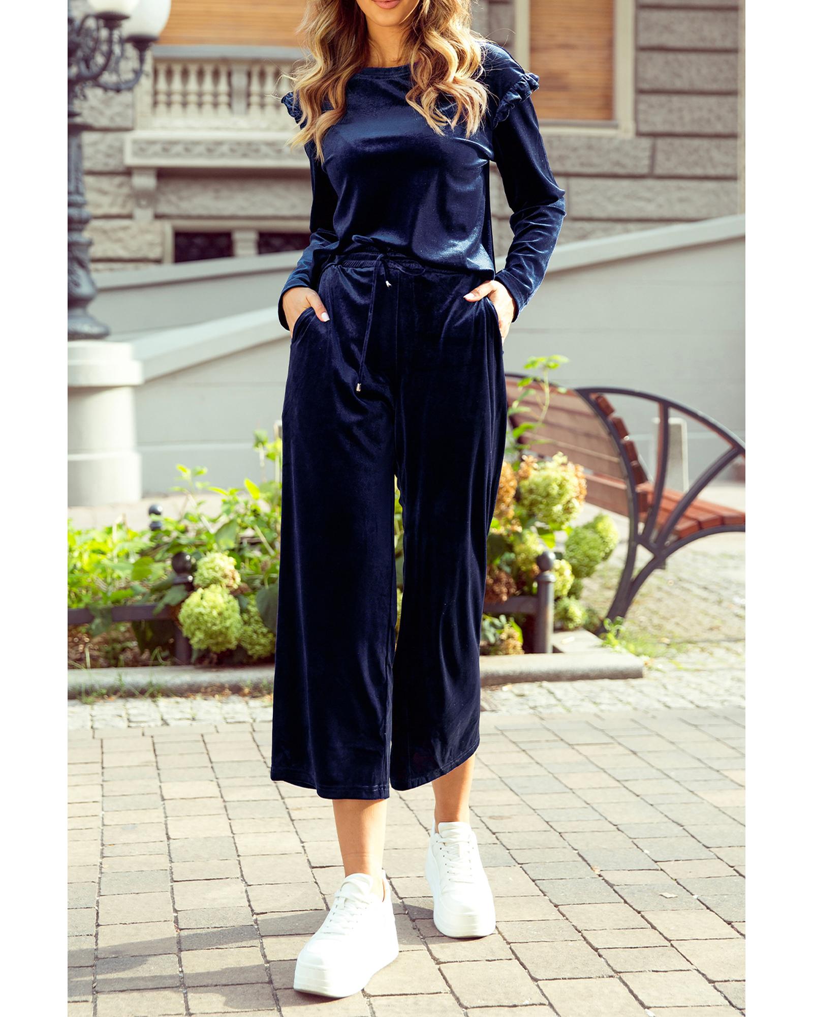 This navy blue solid velvet two-piece pants set offers a stylish and versatile look suitable for various occasions. Designed with a trendy fitted silhouette, it combines comfort and elegance, making it perfect for both dressy and casual wear.