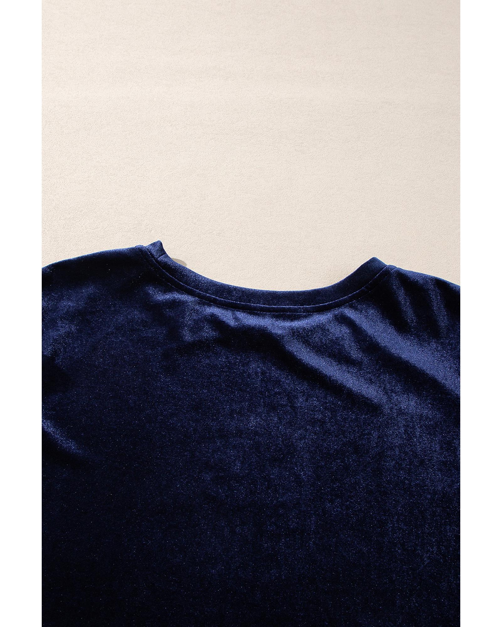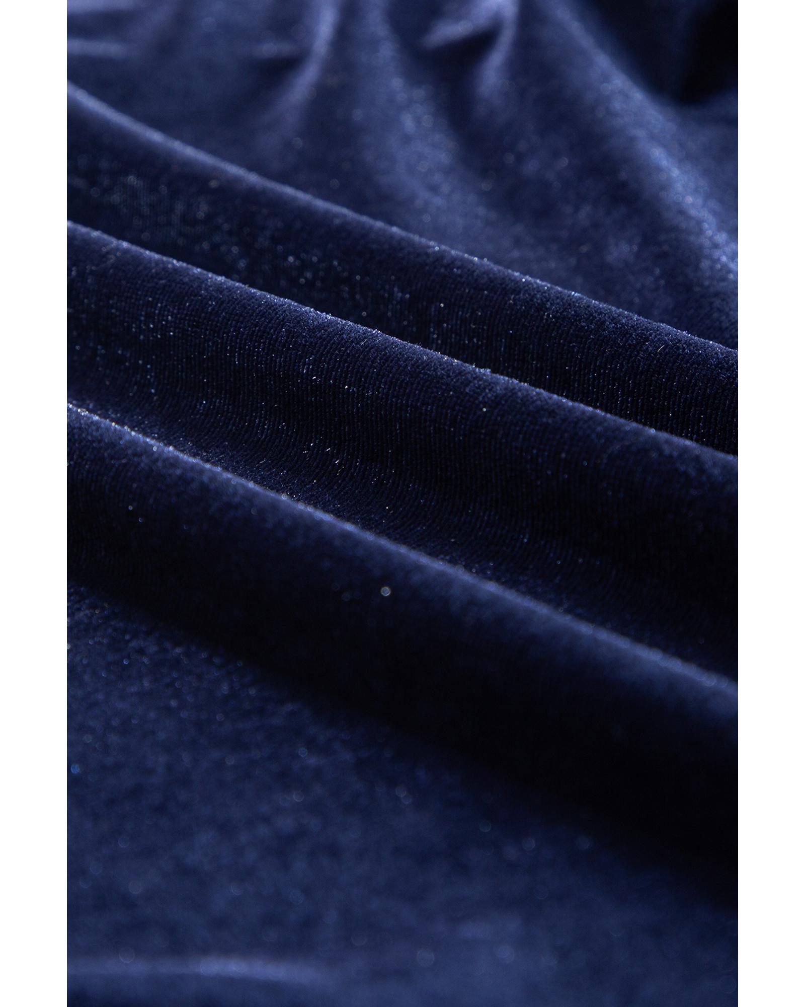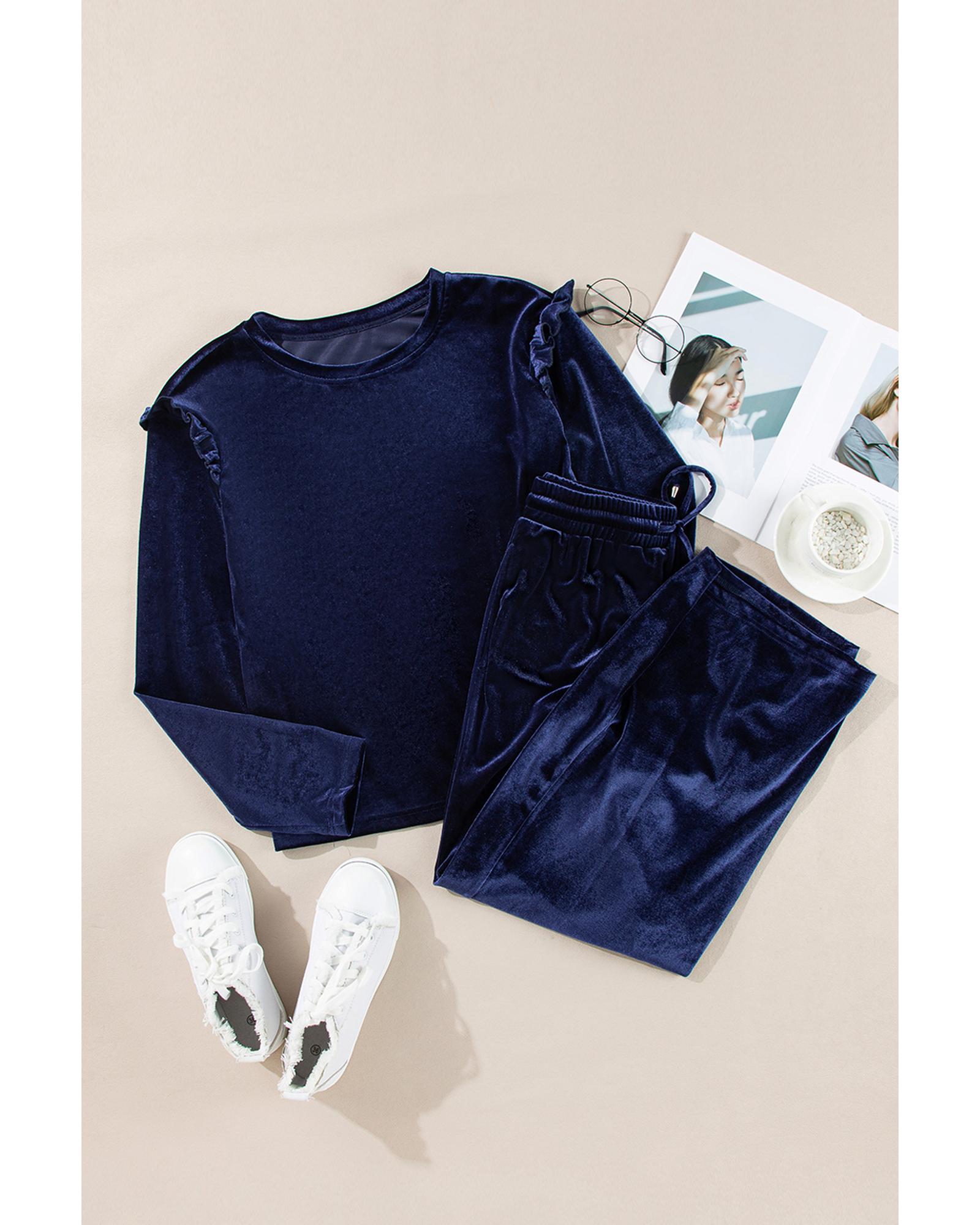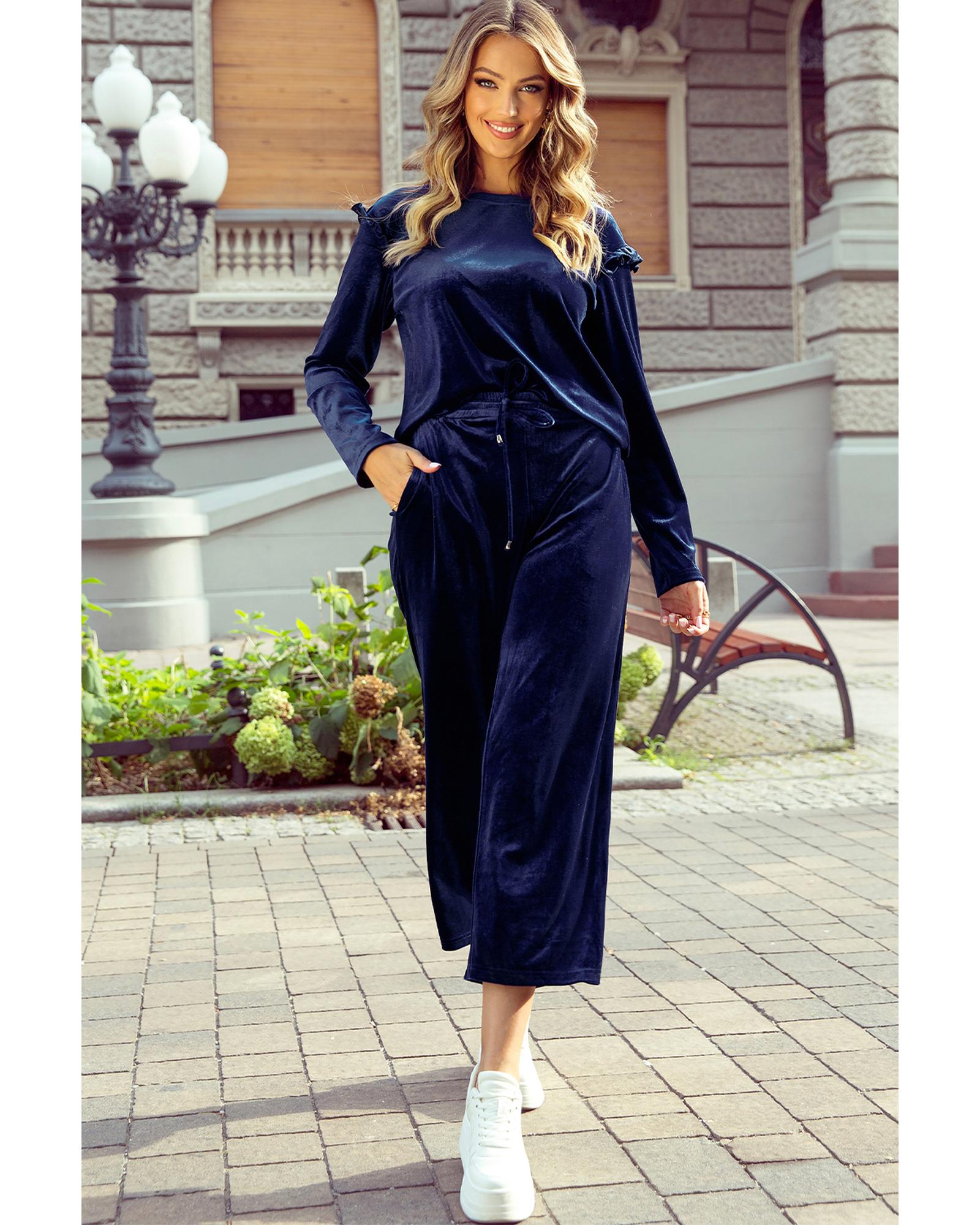 Navy Blue Solid Velvet Ruffled Two Piece Pants Set – 2XL