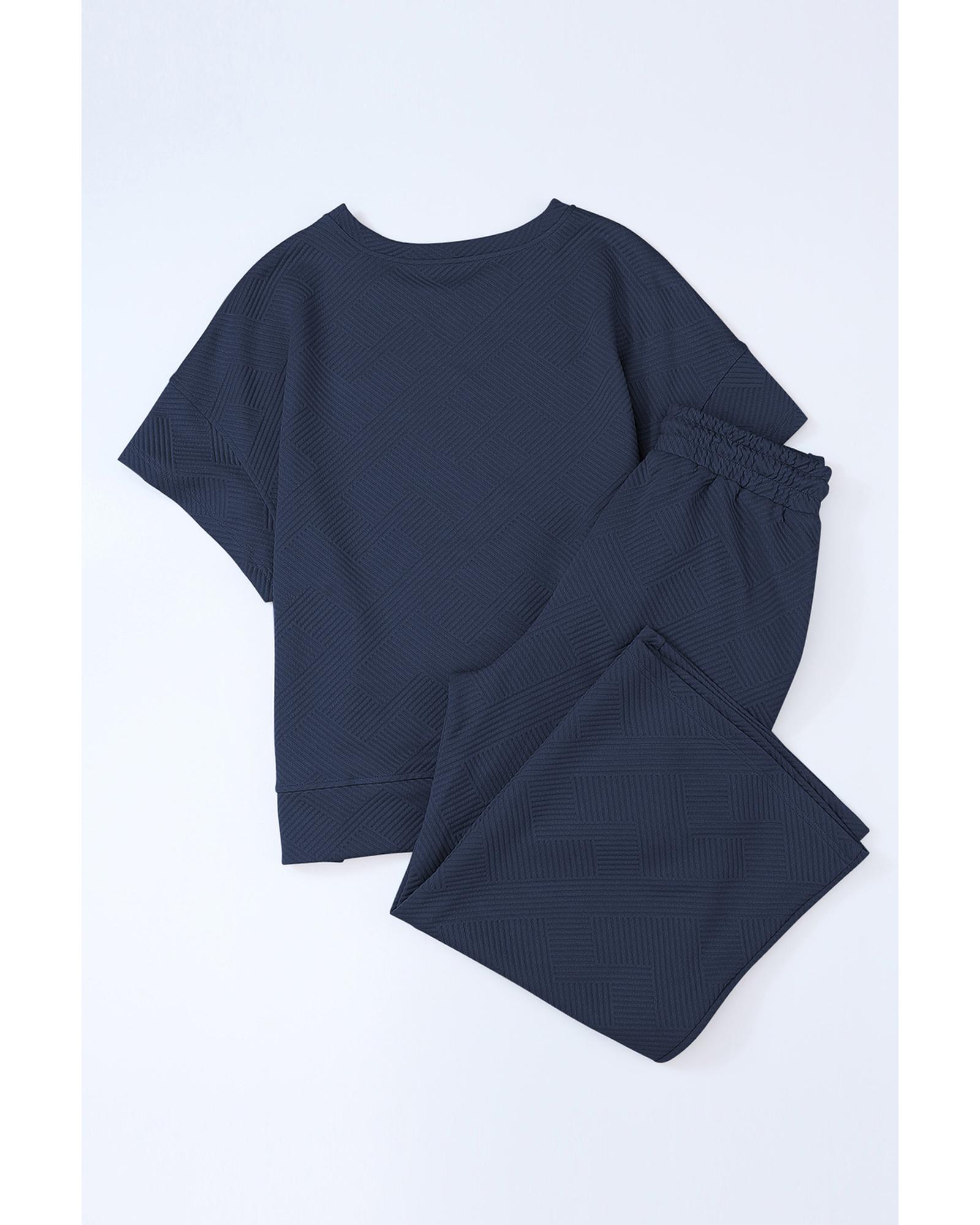 This navy blue textured set includes a loose fit T-shirt and drawstring pants, designed for a comfortable and stylish casual look. The textured fabric adds a fashionable touch, while the loose fit ensures all-day comfort. The drawstring waist allows for a customizable fit, making it suitable for various body types.