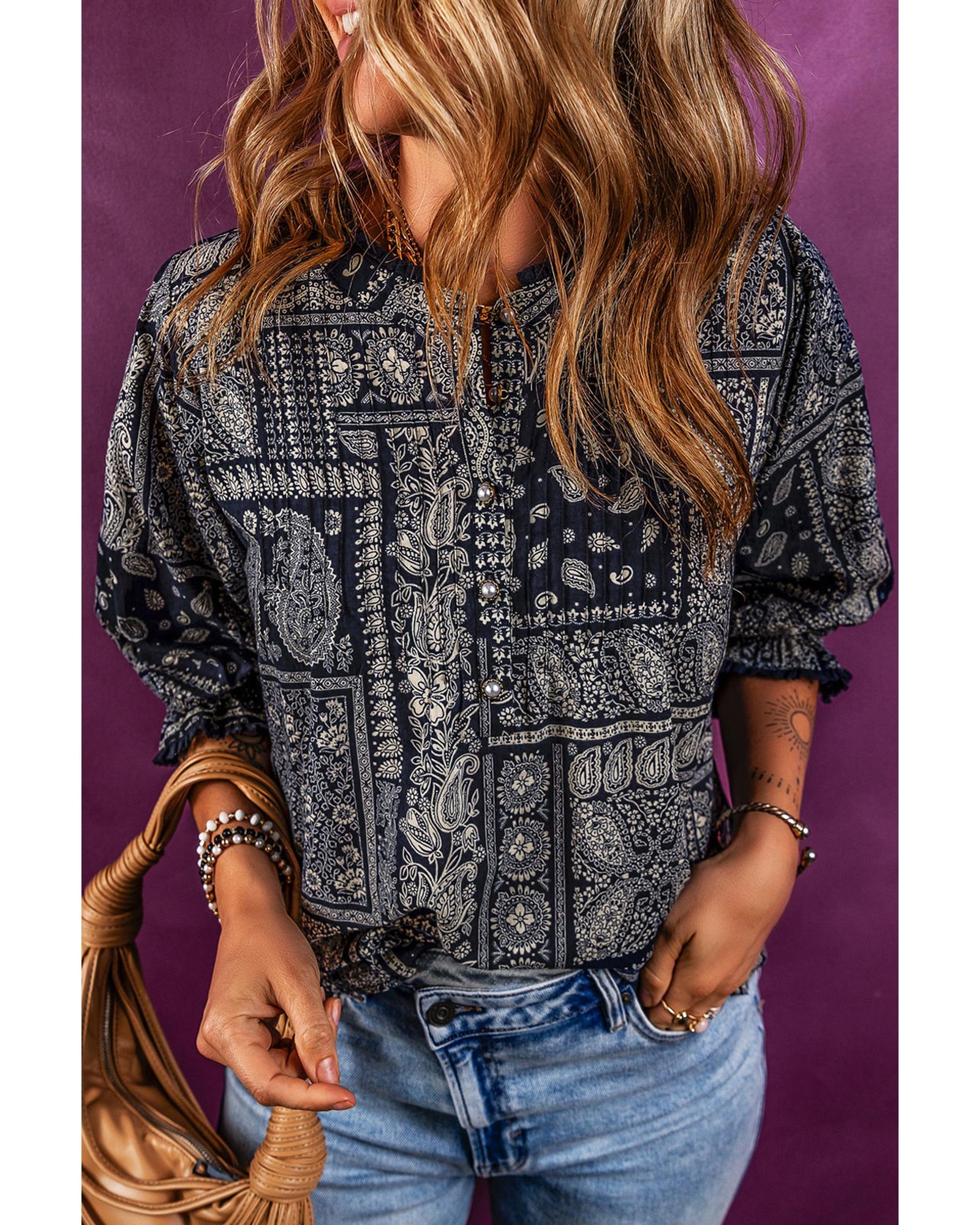This blouse features a vintage boho paisley print with a stylish navy blue color, offering a versatile and eye-catching addition to any wardrobe. Designed with a trendy fitted look, it combines comfort and elegance, making it suitable for various occasions.