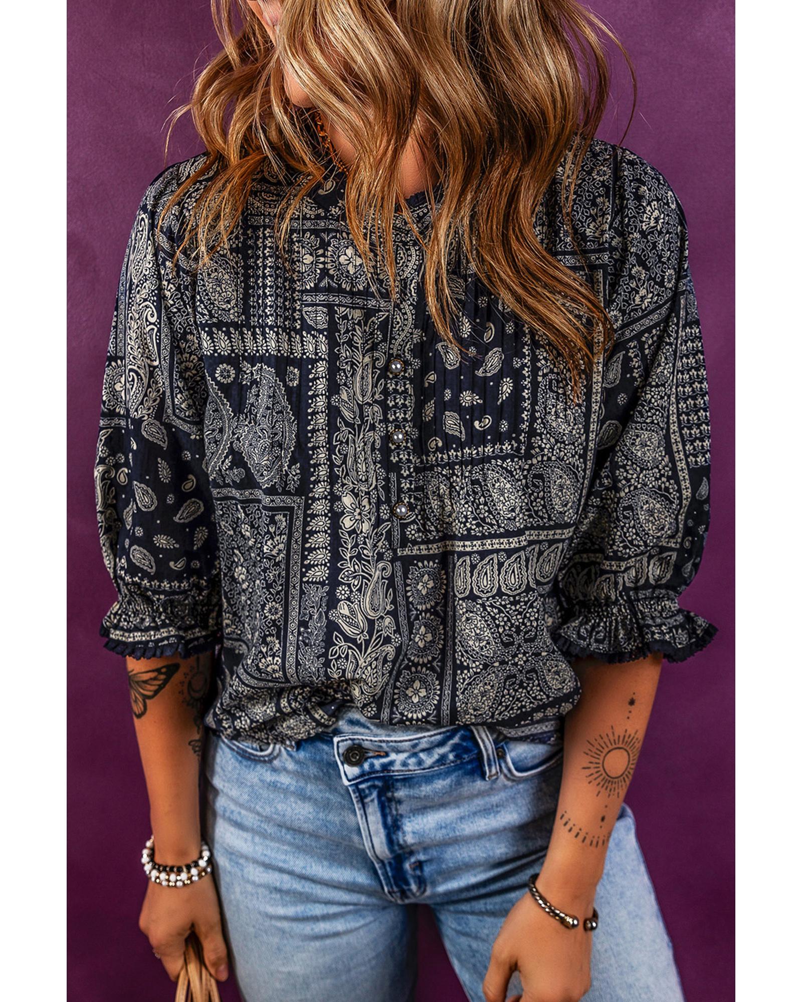 - One navy blue vintage boho paisley print 3/4 sleeve blouse