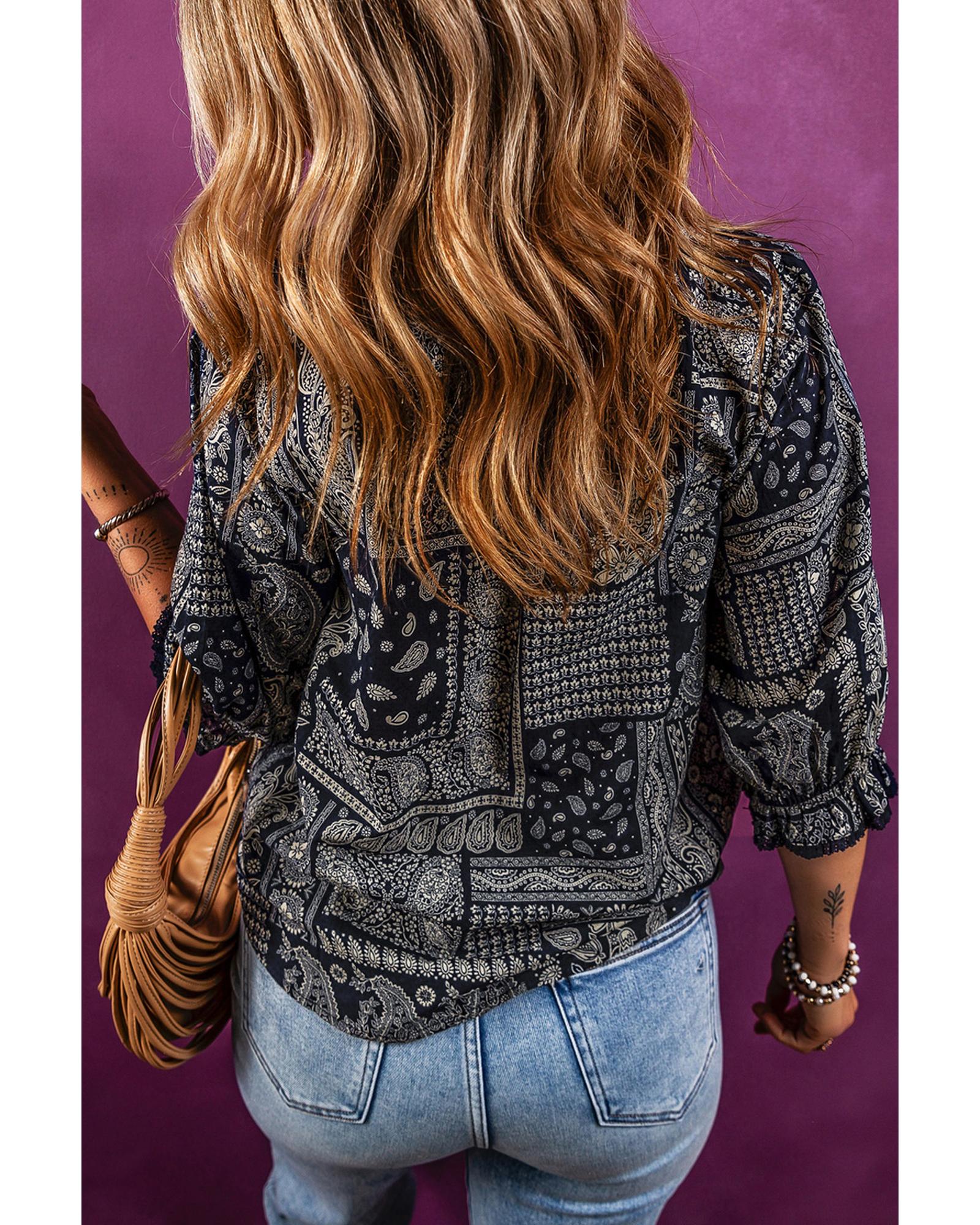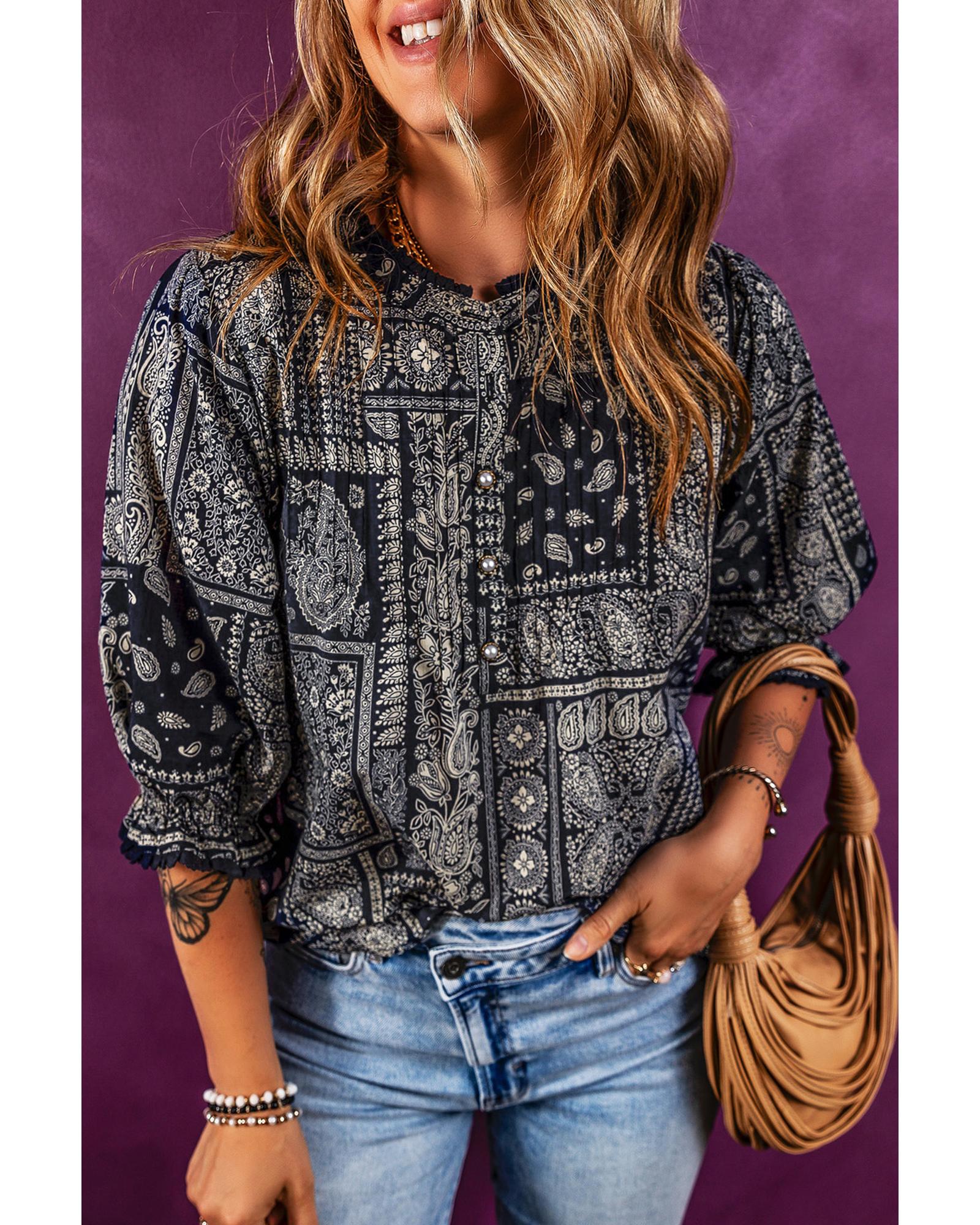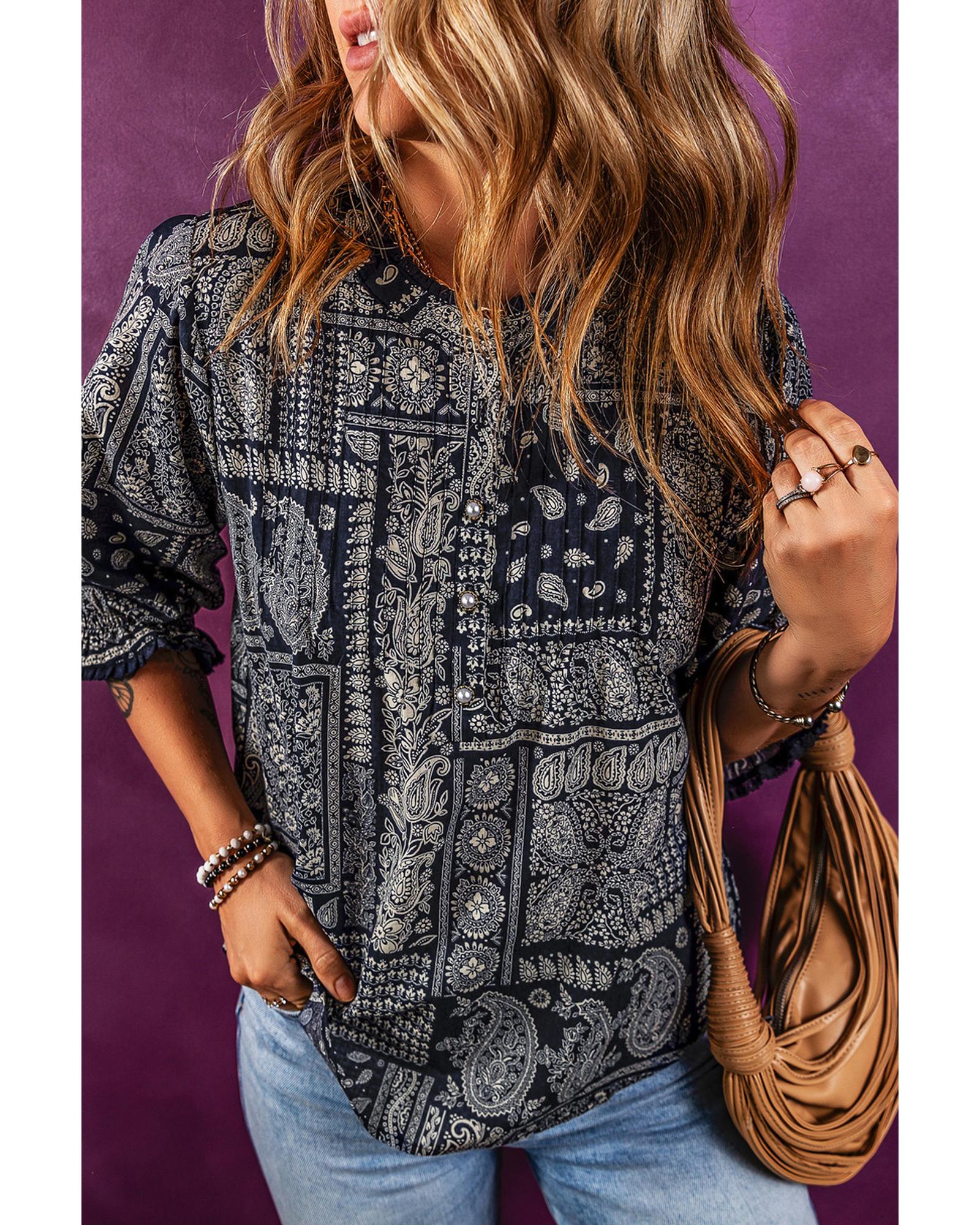 - 1 x Navy Blue Vintage Boho Paisley Print 3/4 Sleeve Blouse