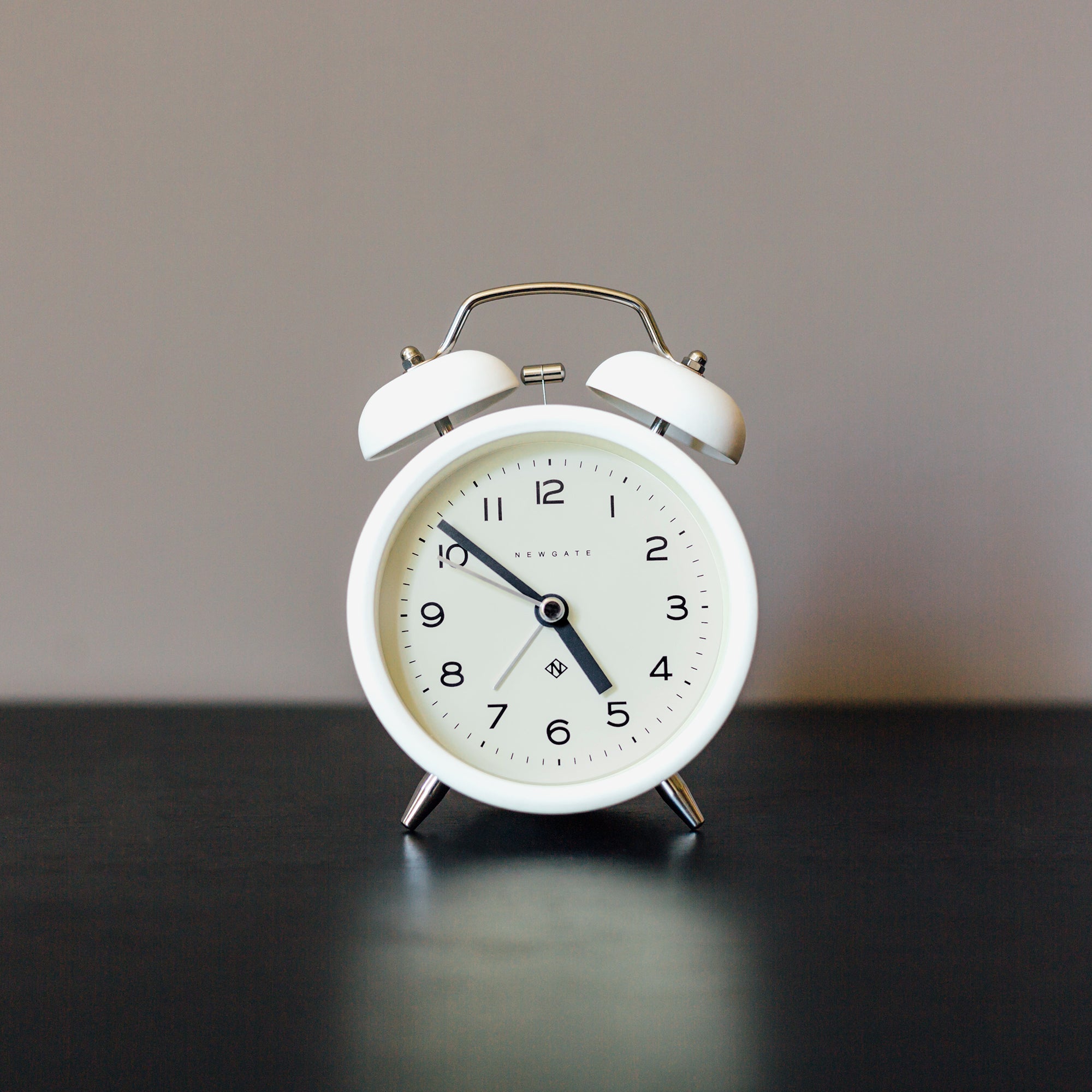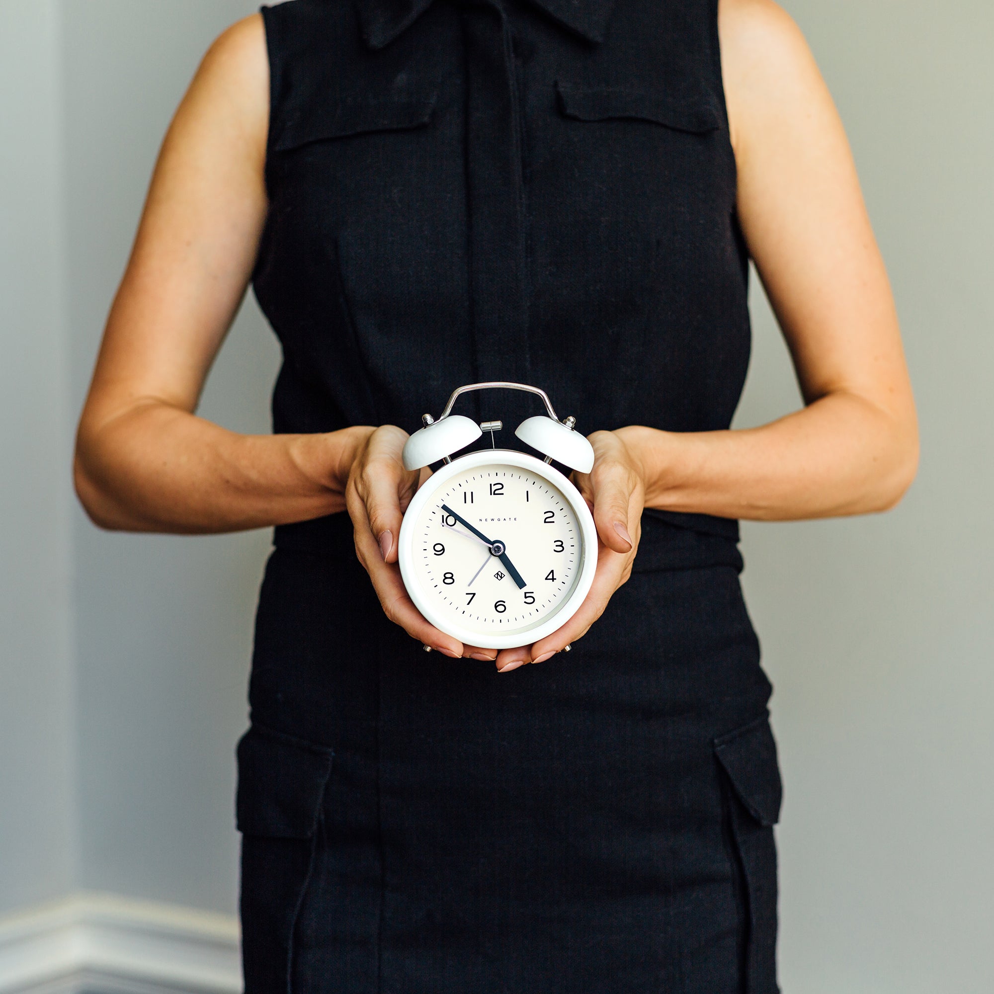 This modern alarm clock features a sleek white design with a contemporary graphic dial. It includes a moving hammer and twin-bell alarm for a classic yet stylish look. The silent sweep movement ensures quiet operation, making it suitable for a peaceful environment.