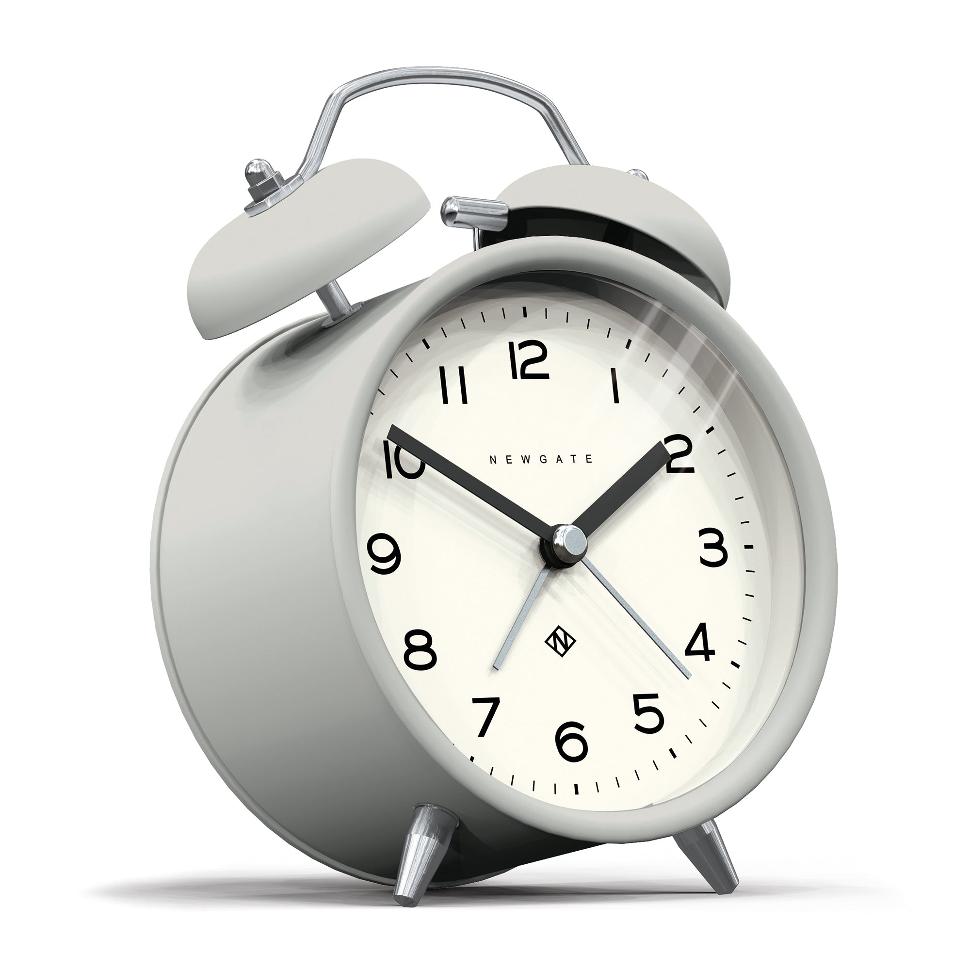 The alarm clock features a modern grey design with a contemporary graphic dial, complemented by a moving hammer and twin-bell alarm for a classic yet updated look. Its silent sweep movement ensures smooth, continuous motion of the hands, providing a quiet environment without ticking sounds.