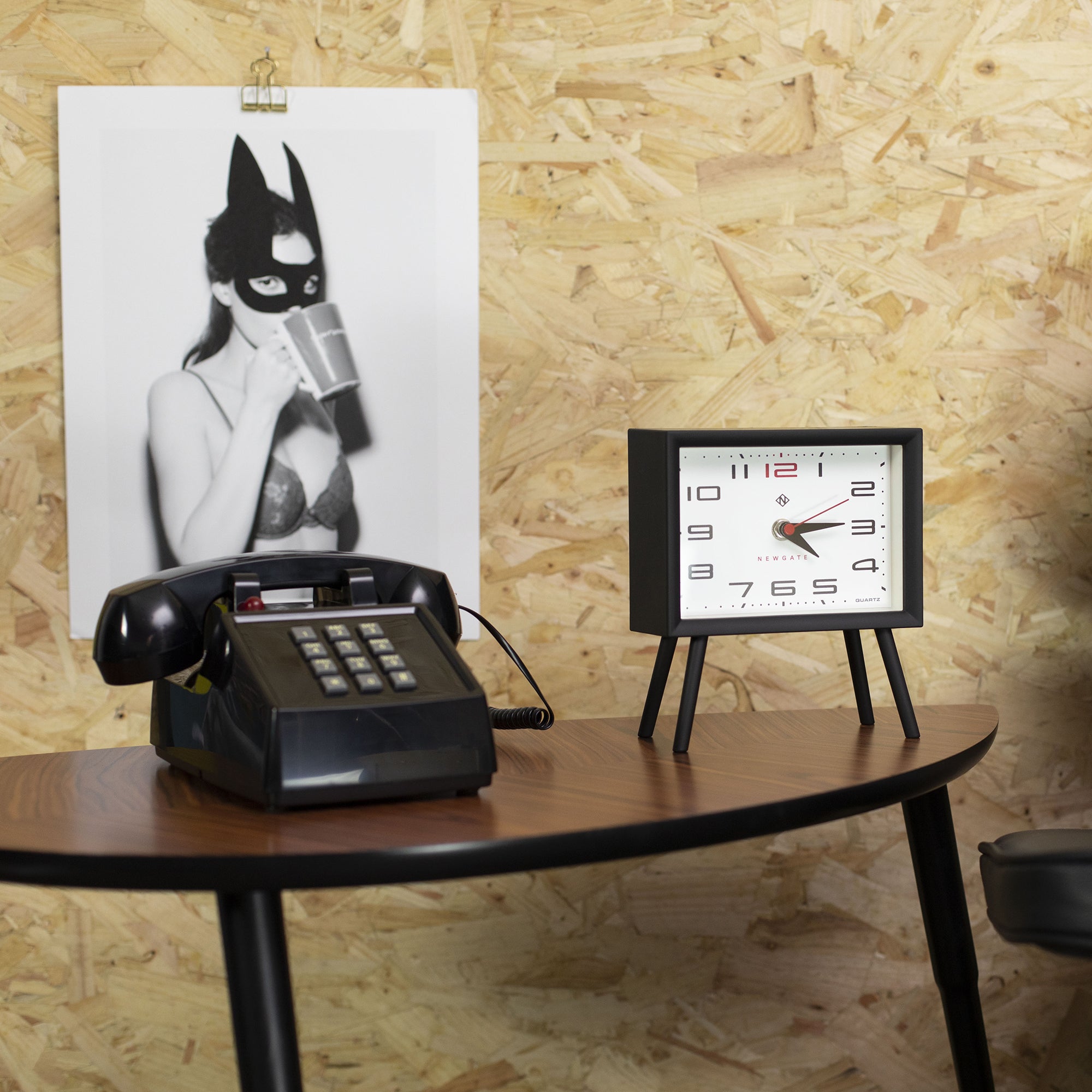 This mantel clock combines modern space-age design with mid-century retro style, featuring a rectangular case with a matte black finish and a contrasting cream dial. It stands on elongated, angled legs, creating a sleek and contemporary appearance. The clock operates with a silent sweep movement, ensuring quiet operation without ticking sounds.