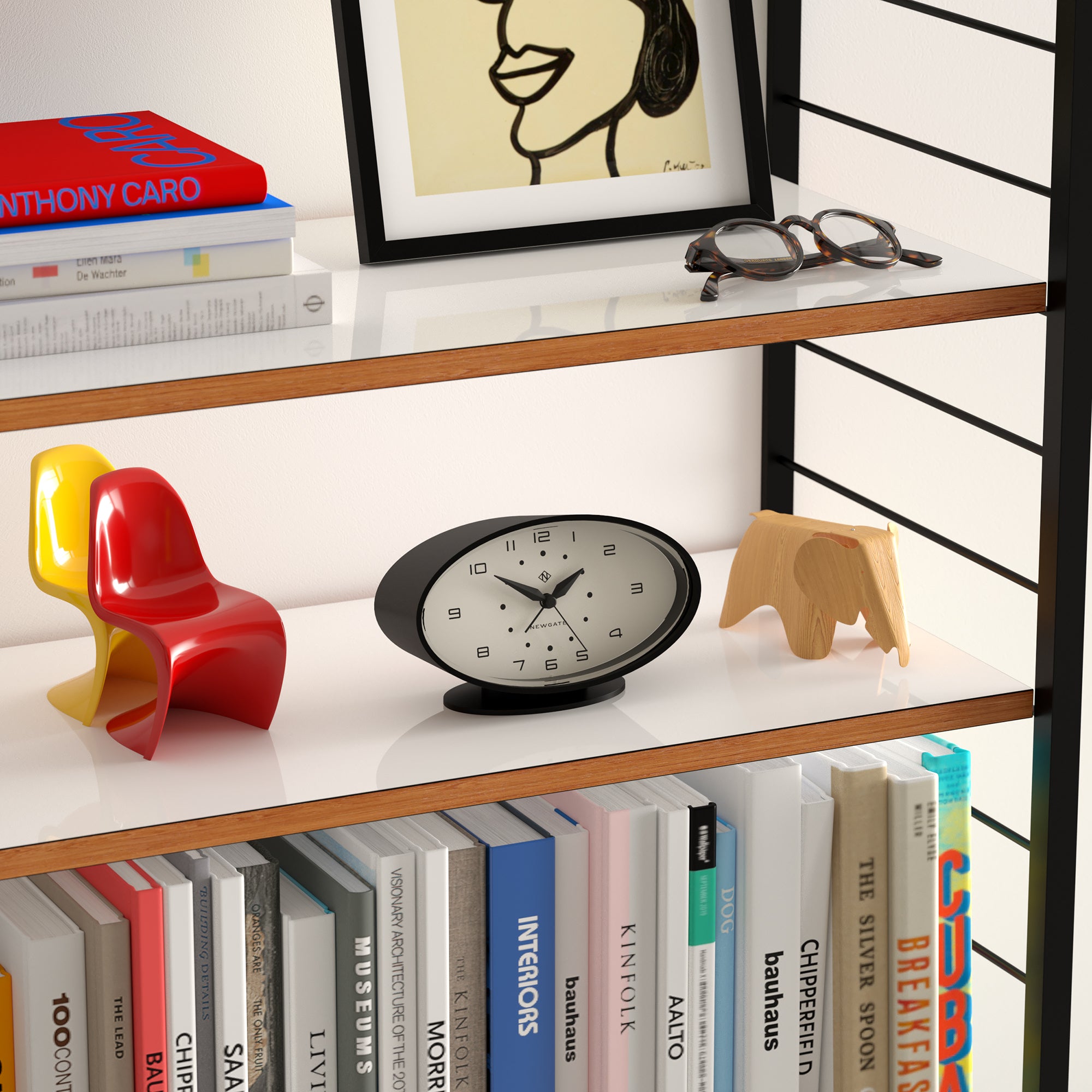 This alarm clock features a modern, oval-shaped design with a retro aesthetic. It has a clean Arabic dial and a matte finish, complemented by an acrylic lens. The clock operates silently with a sweep movement, ensuring no ticking sounds in a quiet environment.