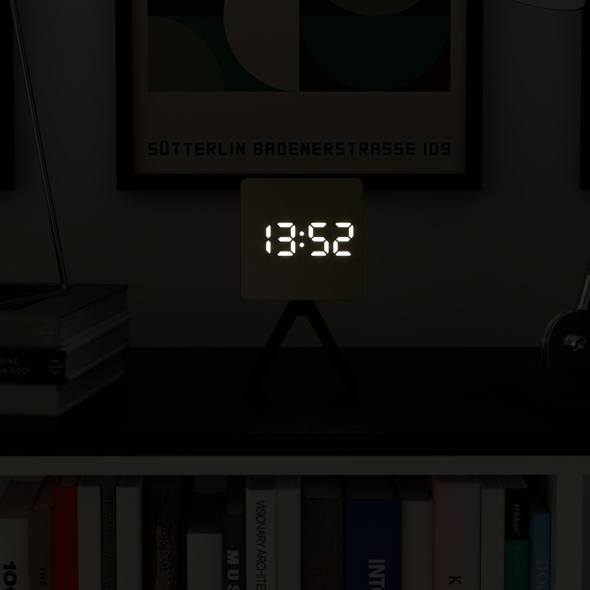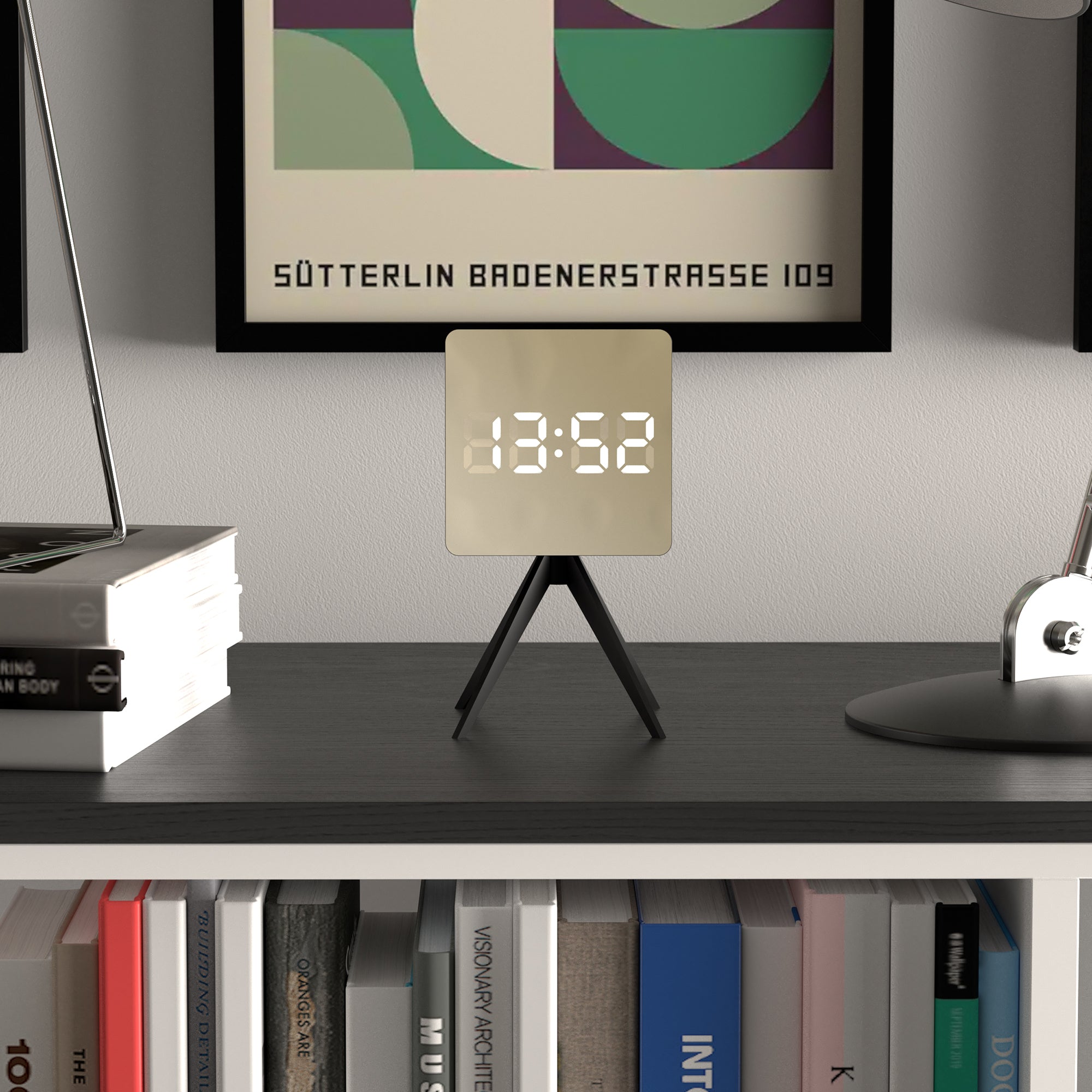 This futuristic digital alarm clock features a space-inspired design with a squared case and a mirror-effect LED screen. It combines modern aesthetics with practical functions, making it suitable for bedside use or as a minimalist desk clock.