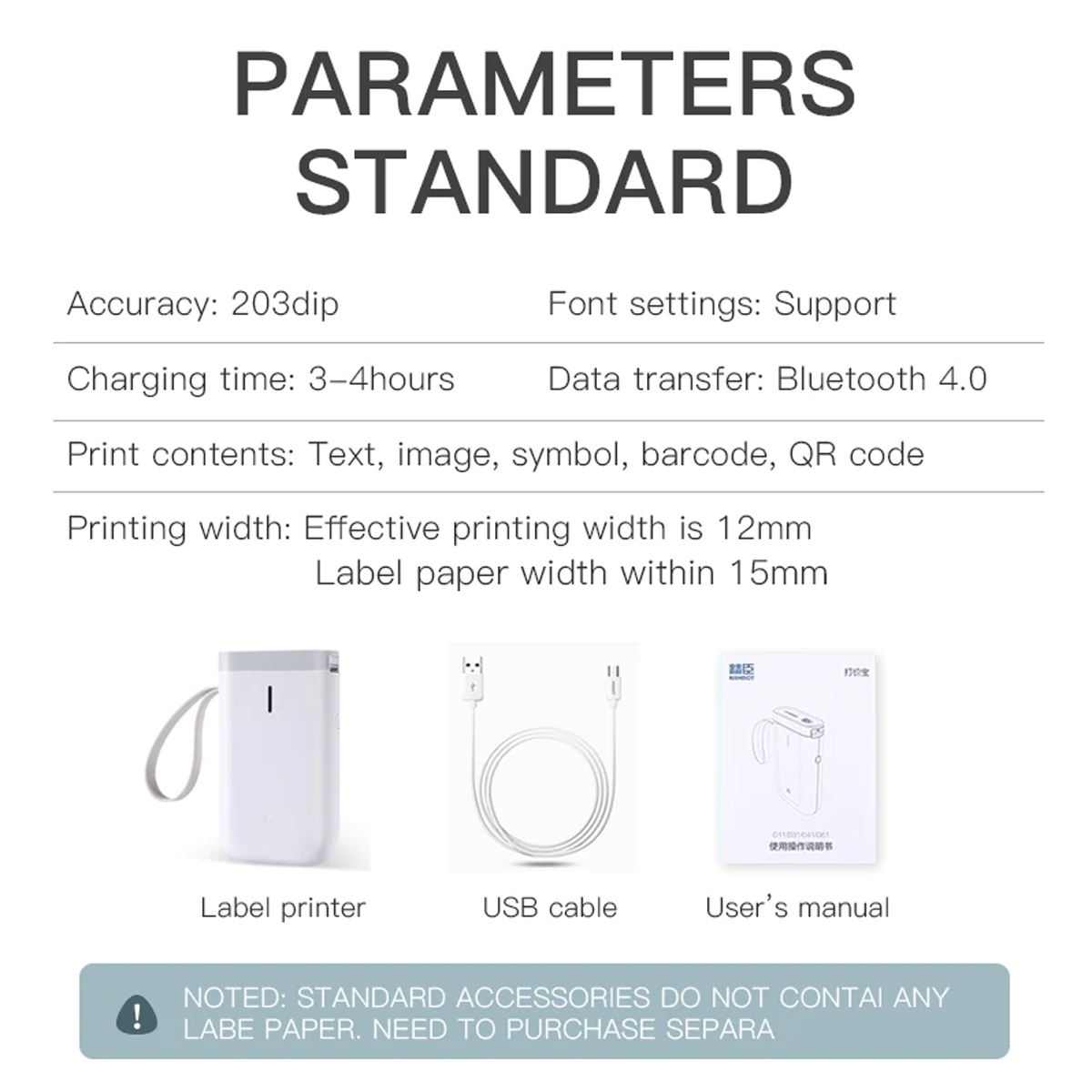 The portable wireless label printer offers a convenient mobile printing solution for everyday use. Compact and lightweight, it allows users to design and print labels up to 15mm wide directly from their mobile devices, making organization and labeling tasks quick and easy.