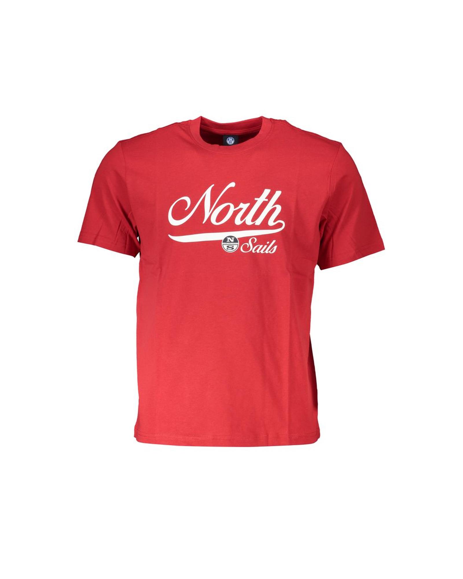 This men’s red cotton T-shirt features a classic crew neck design with short sleeves. It is crafted from 100% cotton, offering comfort and breathability. The shirt is decorated with a print and logo design, making it suitable for casual wear.