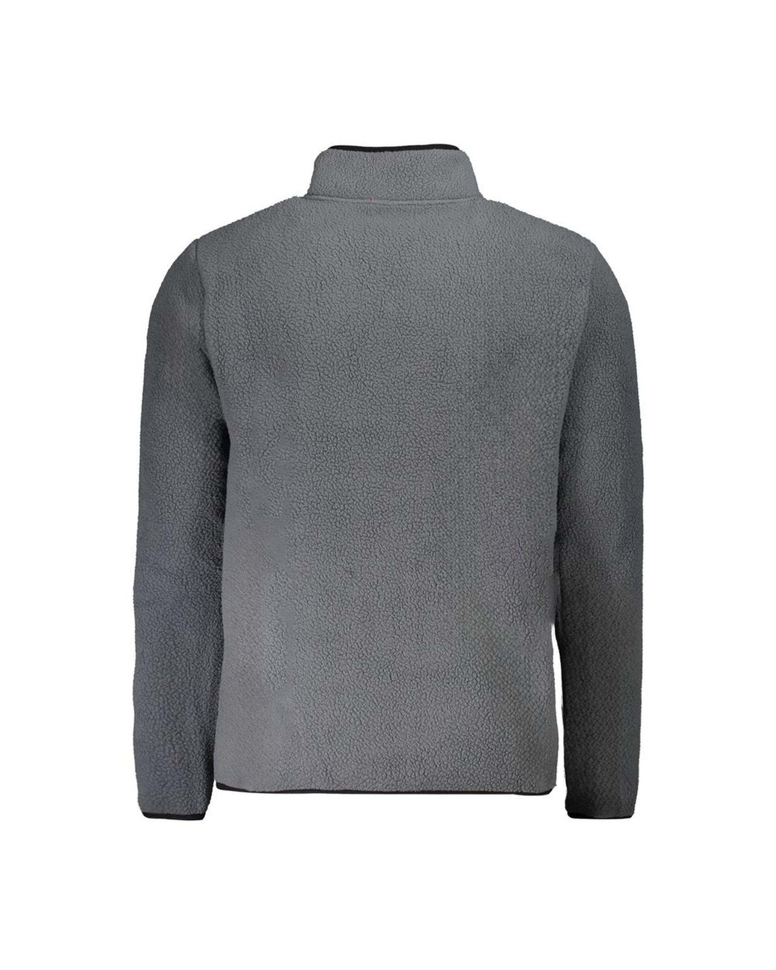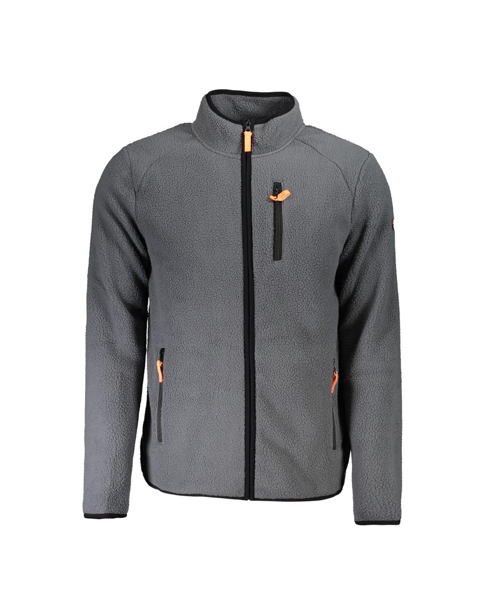 This men’s gray polyester sweater features a classic long sleeve design with functional pockets and contrasting details. It offers a comfortable fit and stylish appearance suitable for casual wear.