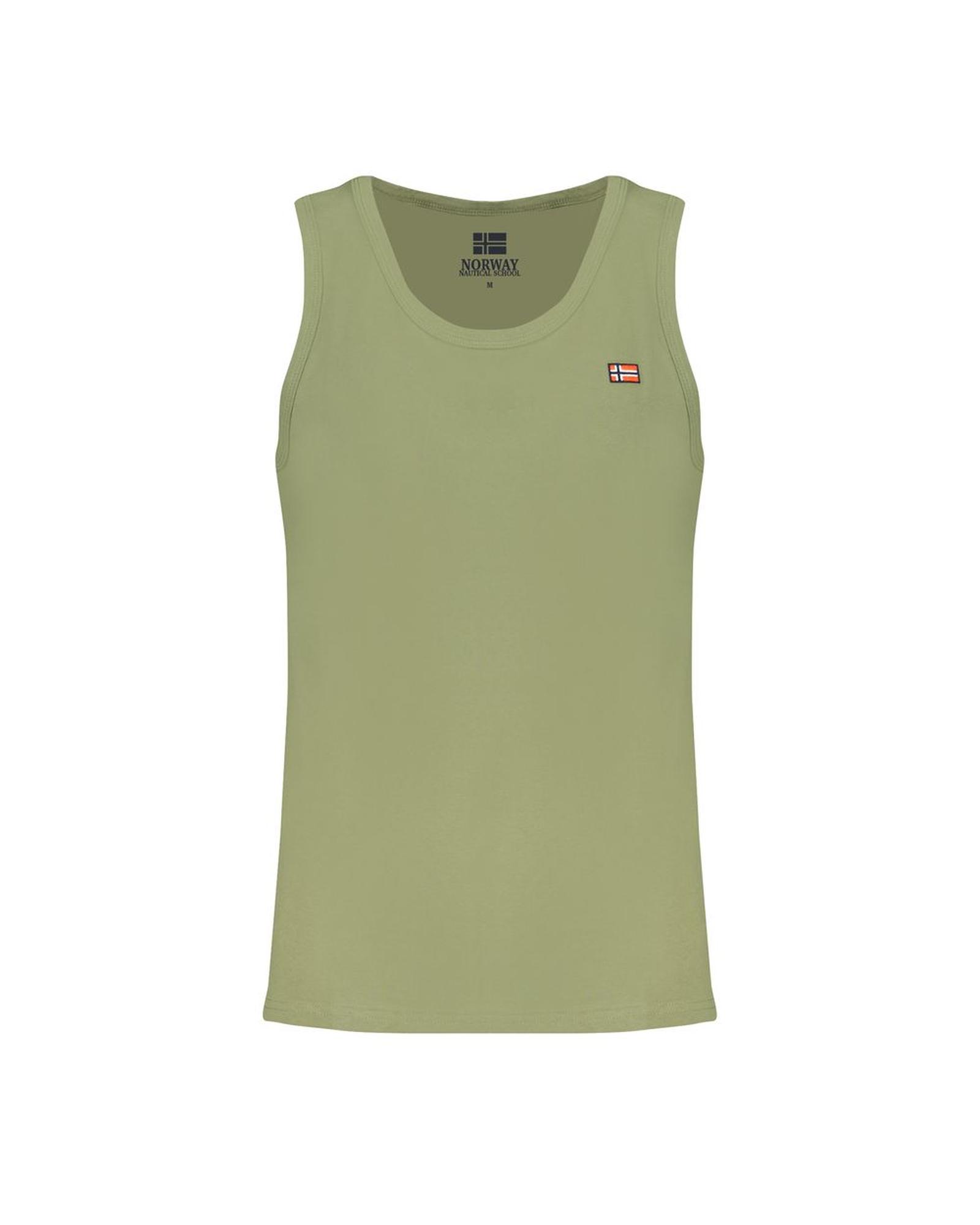 This men’s green cotton shirt features a tank top design with wide shoulders and a crew neck. It is embroidered with intricate designs and includes a brand logo, offering a stylish and comfortable fit.