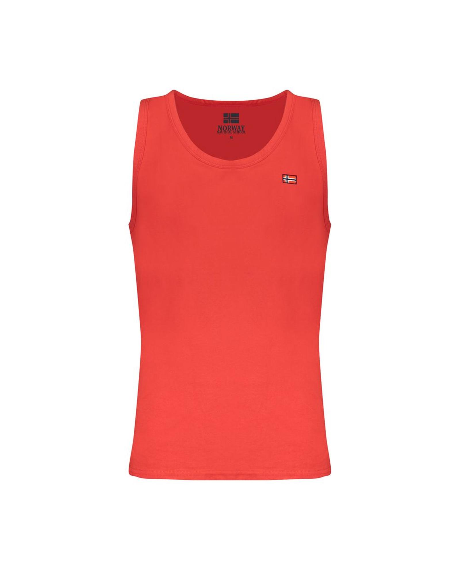 This men’s red cotton shirt features a tank top design with wide shoulders and a crew neck. It is crafted from 100% cotton and includes an embroidered signature logo for added detail. The shirt is available in size M.